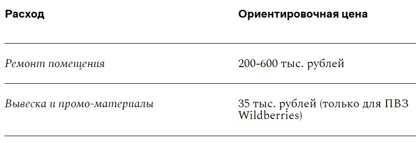 Посчитали стоимость аренды помещения, ремонта, покупки мебели и необходимой техники, а также ежемесячные затраты на зарплаты сотрудников и поддержание работы ПВЗ. Эксперты — Игорь Ганин, предприниматель, владелец ПВЗ Wildberries и Ozon в Астрахани, и Олег Литвиненко, владелец ПВЗ «Яндекс.Маркета».