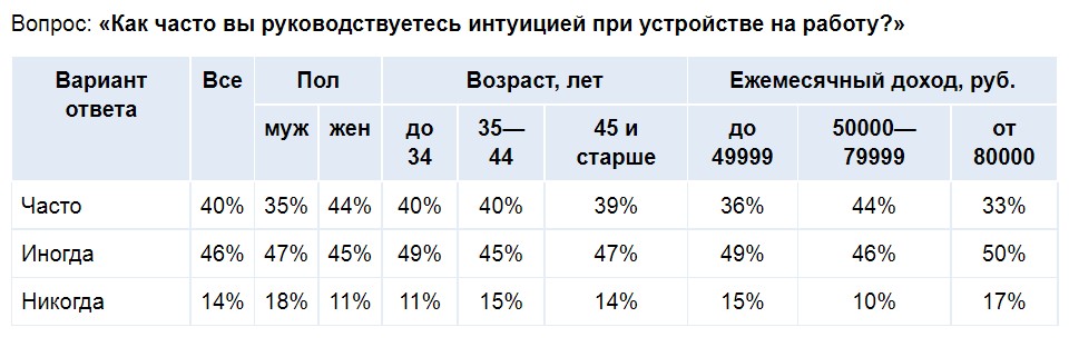 В общем 86 % россиян руководствуются интуицией при устройстве на работу: 40 % — часто, 46 % — иногда. Причём чаще всего доверяют внутреннему голосу женщины — 89 % против 82 % среди мужчин.
