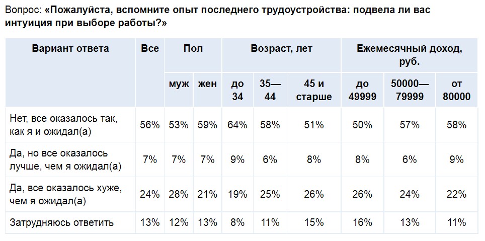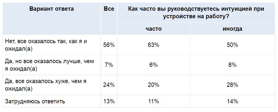 - Среди тех, кто полагается на свои ощущения при поиске работы, каждый второй уверяет, что интуиция его не подводила — таковых 56 %.