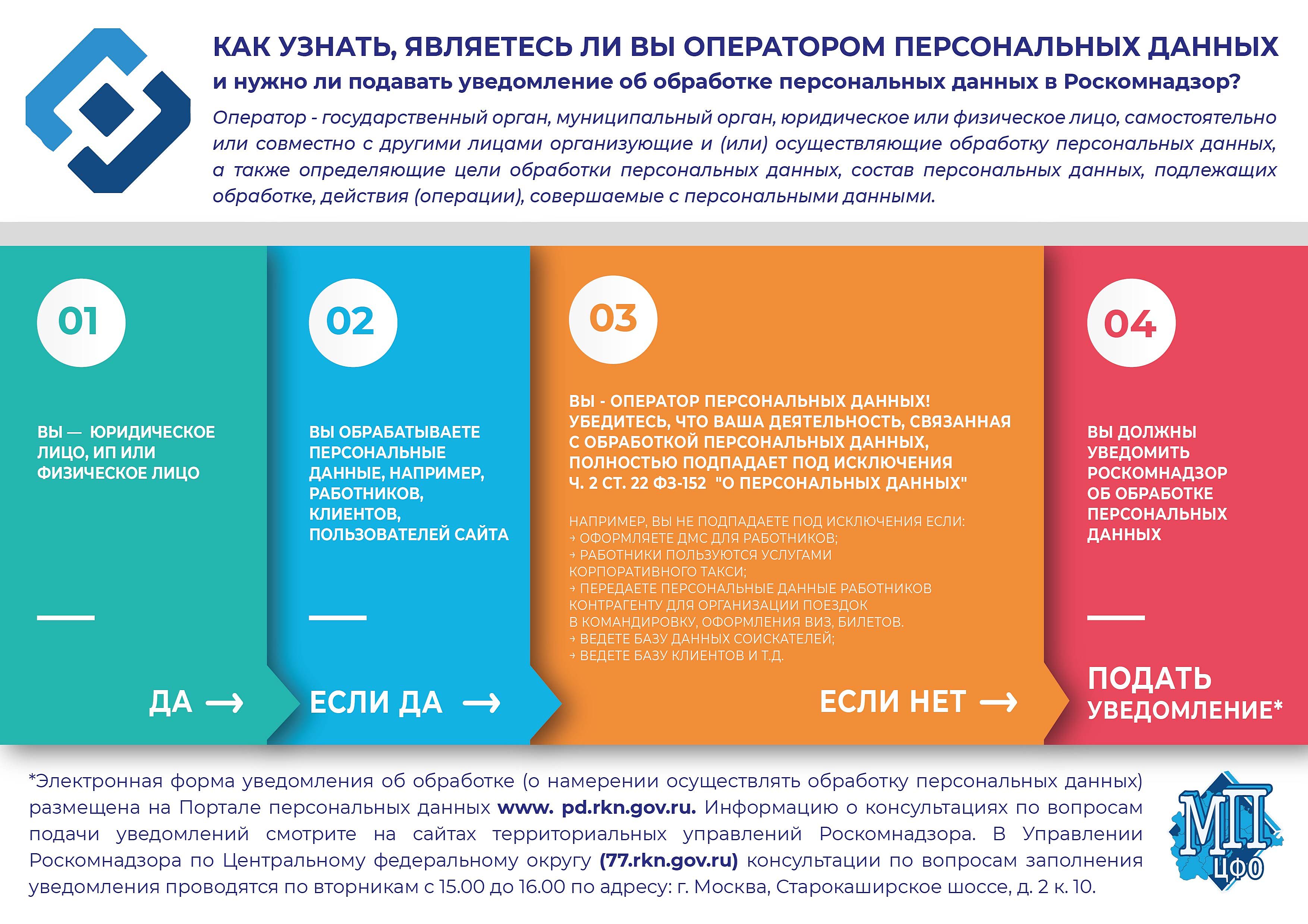 Для начала следует разобраться с термином «оператор обработки ПД». Ими считаются не только органы государственной власти, но и физлица и юрлица, собственно осуществляющие обработку данных. Для операторов, осуществляющих эту деятельность на постоянной основе и/или с предоставлением данных третьим лицам, предусмотрен специальный реестр. Подать уведомление об обработке ПД такой оператор должен до начала обработки, в уведомлении указать цели и объёмы работы с данными.