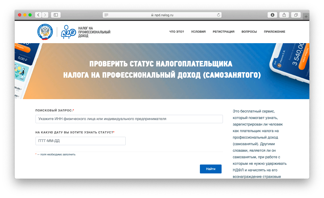 Проверить, прошла регистрация или нет, можно через сервис налоговой. В первое поле нужно вбить свой ИНН, во второе — день проверки статуса, затем нажать кнопку «Найти».