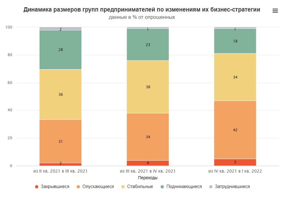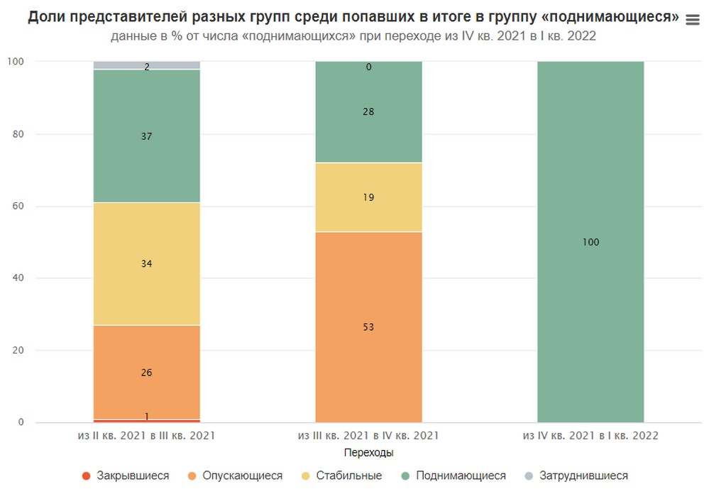 Доля «опускающихся» выросла на 11 процентных пунктов (п. п.), с 31 % до 42 %. А доля «закрывшихся» — на 3 п. п., с 2 % до 5 %. При этом доля «поднимающихся» на 10 п. п. упала, с 28 % до 18 %. Единственная группа, размер которой лишь немного колебался, — это «стабильные».