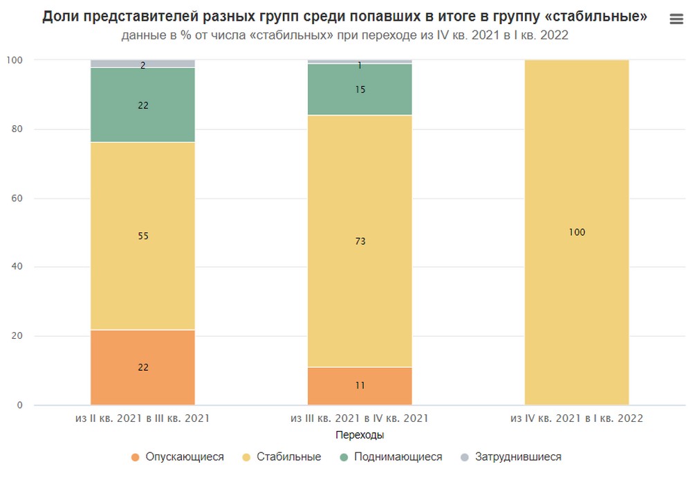 Группа «стабильные» и в прошлых периодах в основном состояла из тех, кто сохранял своё положение. На границе II и III кварталов 2021 года 55 % уже были «стабильными», а через три месяца их стало 73 %. Таким образом, попадание в группу «стабильные» тоже можно было в определённой мере предсказать.