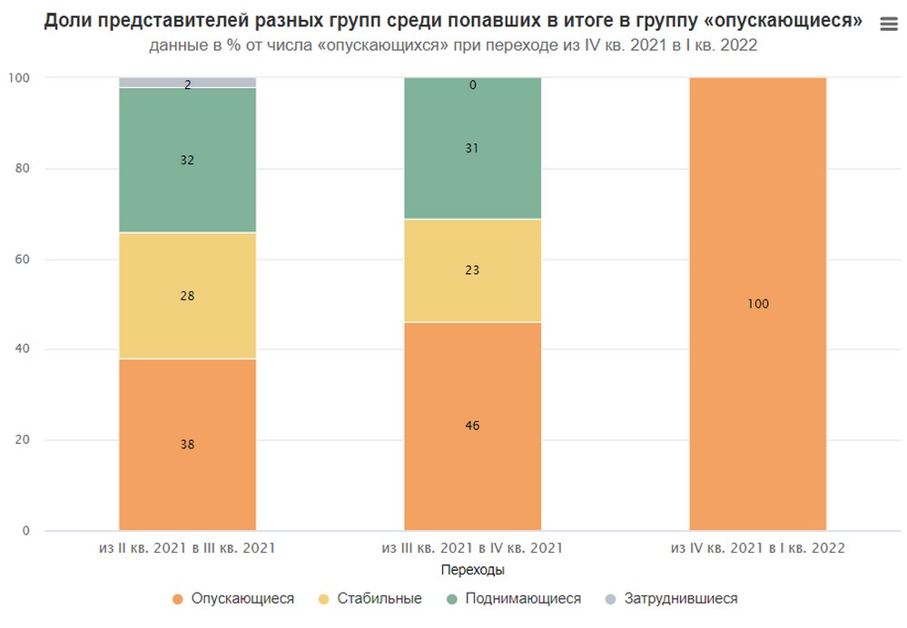 По результатам двух предыдущих замеров доля «поднимающихся» среди них не увеличивалась, как росли доли двух ранее рассмотренных групп, а существенно уменьшалась — с 37 % до 28 %. Увеличивалась же в этой группе, напротив, доля «опускающихся» — с 26 % до 53 %.