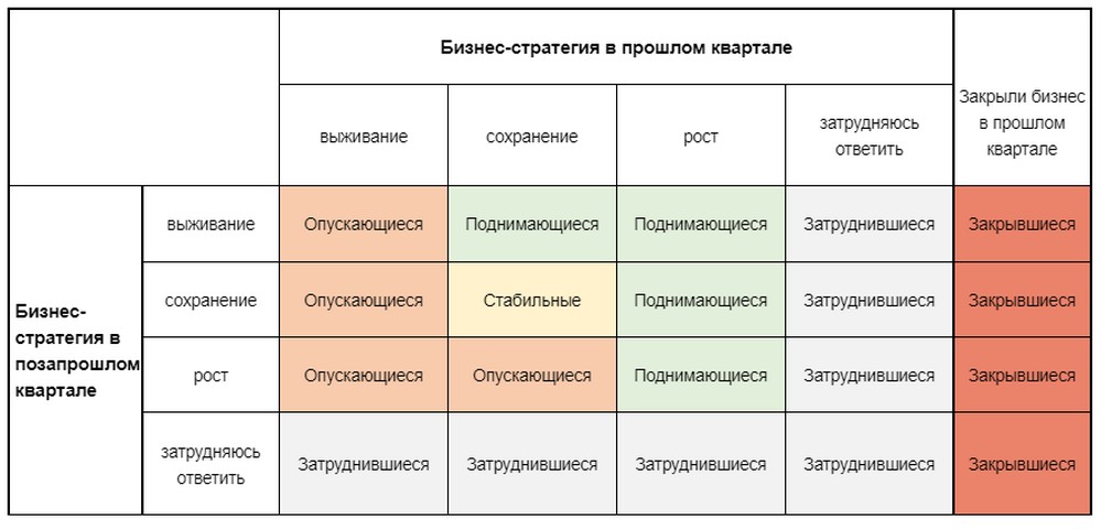 По окончании каждого квартала предприниматели отвечали на вопрос о том, какой из трёх бизнес-стратегий они придерживались: выживание, сохранение или рост.