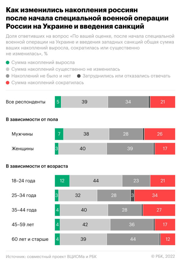 Накопления у пятой части россиян после 24 февраля 2022 года и введения западных санкций упали. А ещё у 5 % — выросли.