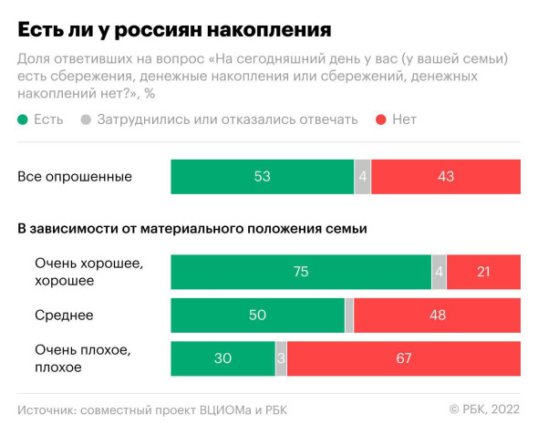 Сбережения определённо есть сегодня у 53 % российских семей, члены которых участвовали в совместном исследовании ВЦИОМа и РБК.
