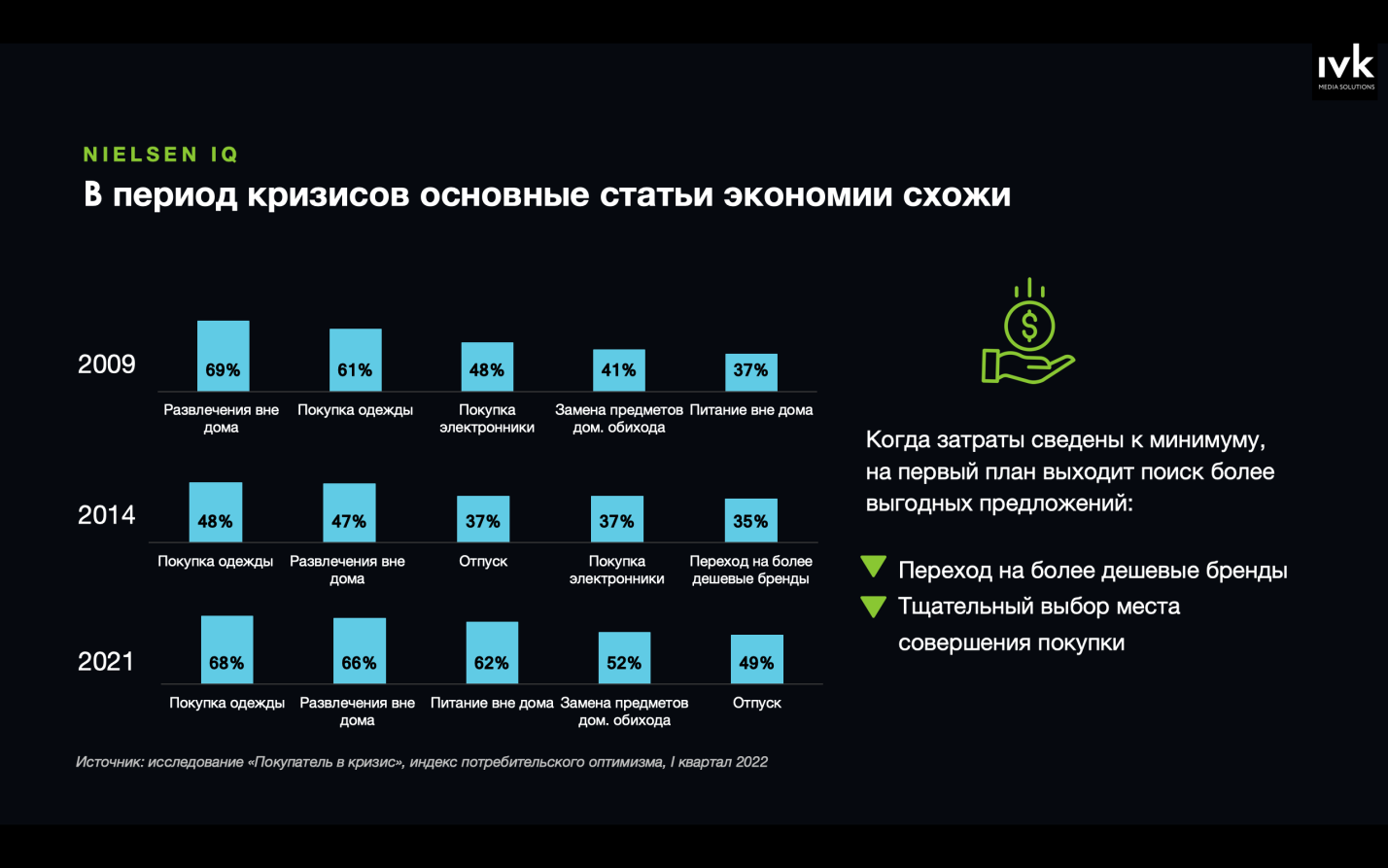 Снижение спроса в краткосрочной перспективе, а в долгосрочной — сохранение повседневной рутины, будут искать бренды, которые в неё впишутся и дадут прежний результат. Снижение спроса в краткосрочной перспективе, а затем выберут те бренды, которые окажутся в нужное время в нужном месте и полностью ответят на их возникшую потребность. Сохранение спроса в краткосрочной перспективе, а потом будут тщательно выбирать бренды на замену ушедшим, для них важно сделать по-настоящему лучший выбор, а не вынужденный.
