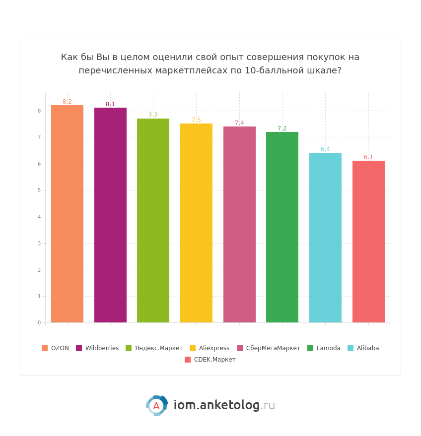 - Больше всего довольны своим опытом покупок на маркетплейсах пользователи Ozon и Wildberries — 8,2 и 8,1 балла из 10.