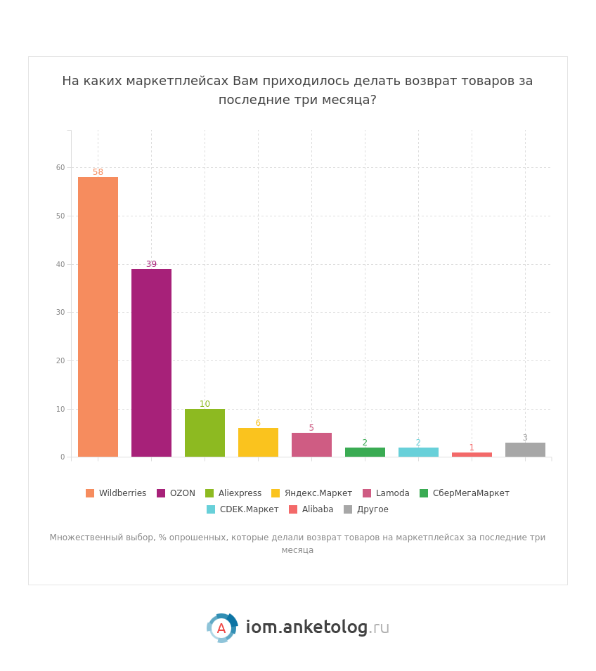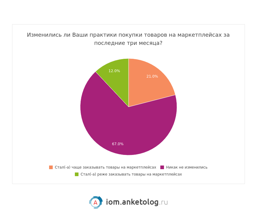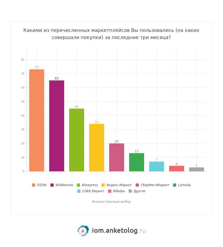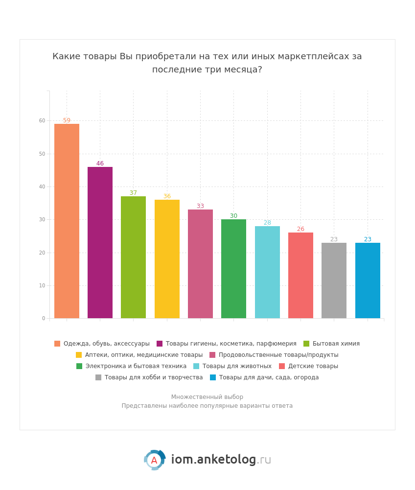 - Наибольшим спросом на маркетплейсах пользуются одежда, обувь и аксессуары — товары этой категории за последние три месяца покупали 59 % потребителей.