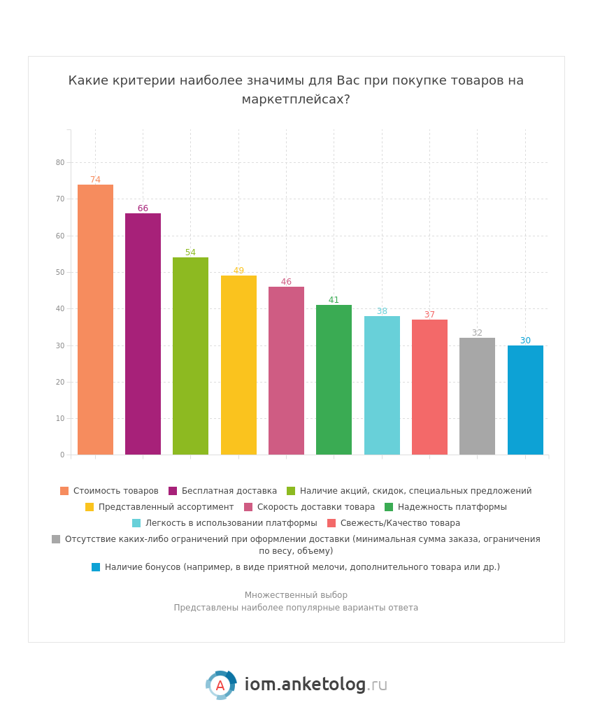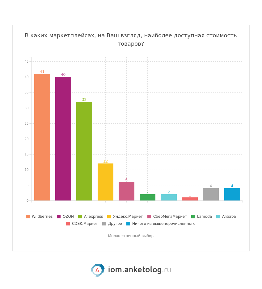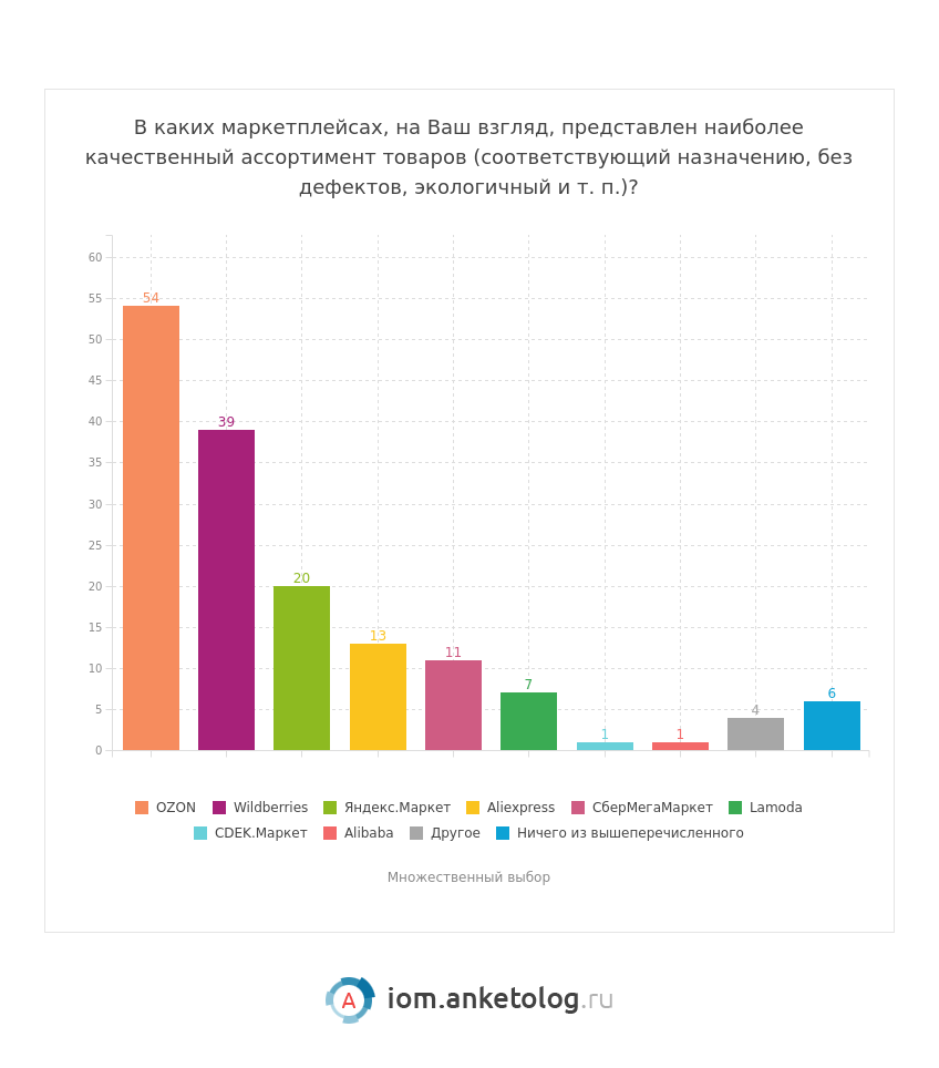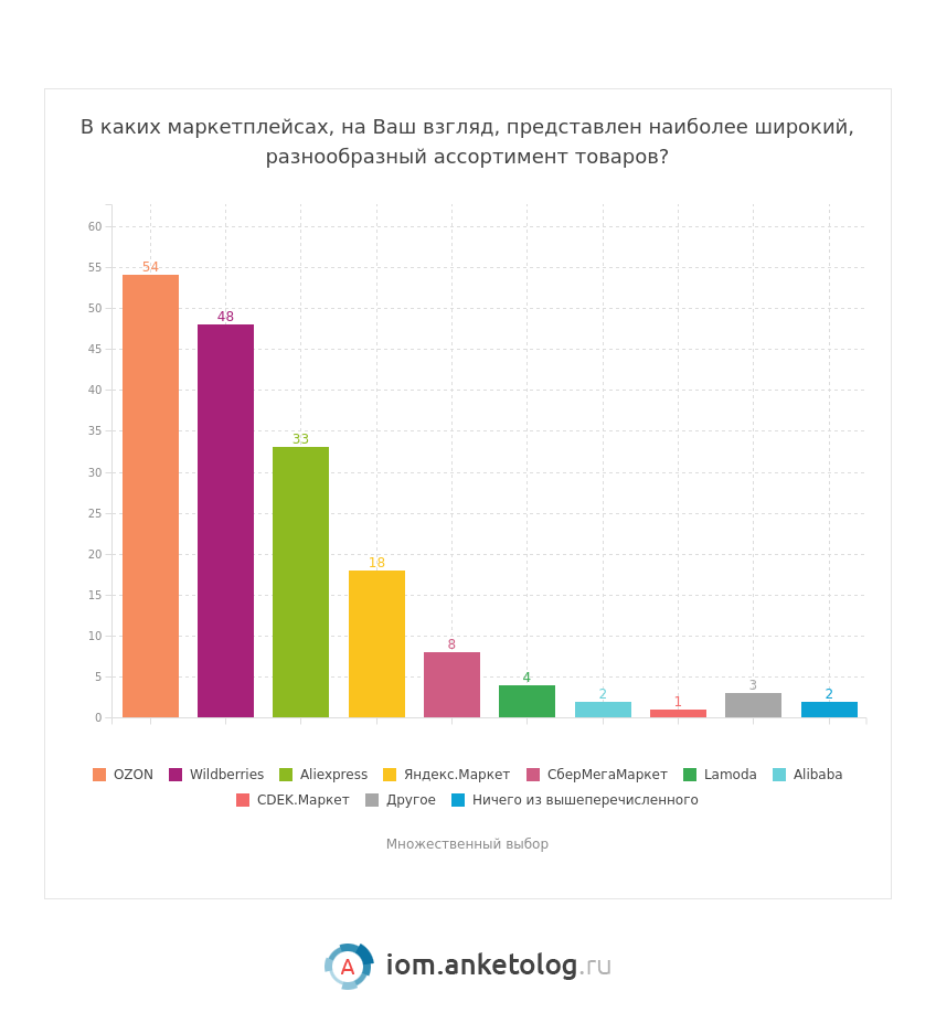 - Наибольшим спросом на маркетплейсах пользуются одежда, обувь и аксессуары — товары этой категории за последние три месяца покупали 59 % потребителей.