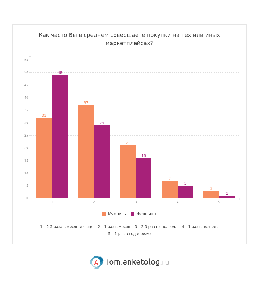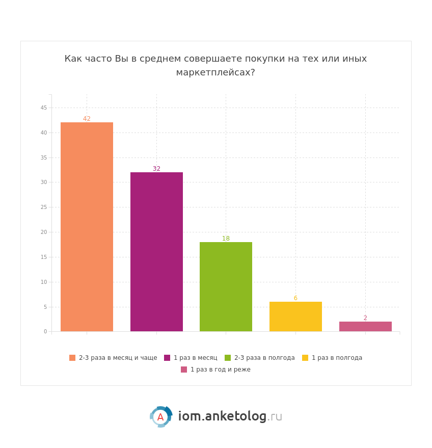 - 42 % потребителей совершают покупки на маркетплейсах 2-3 раза в месяц и чаще.