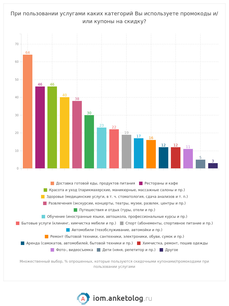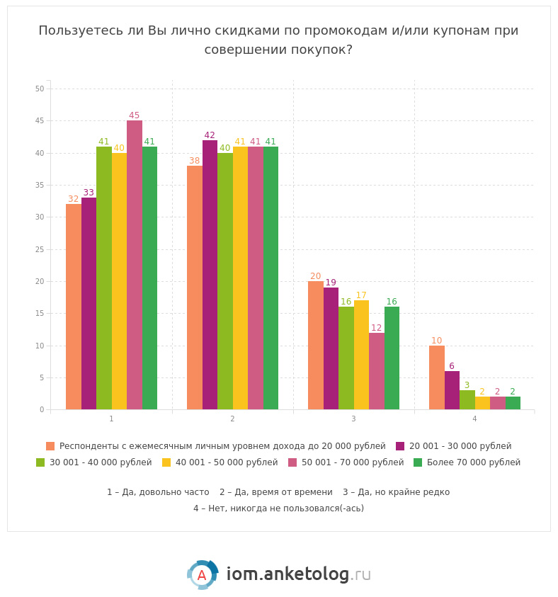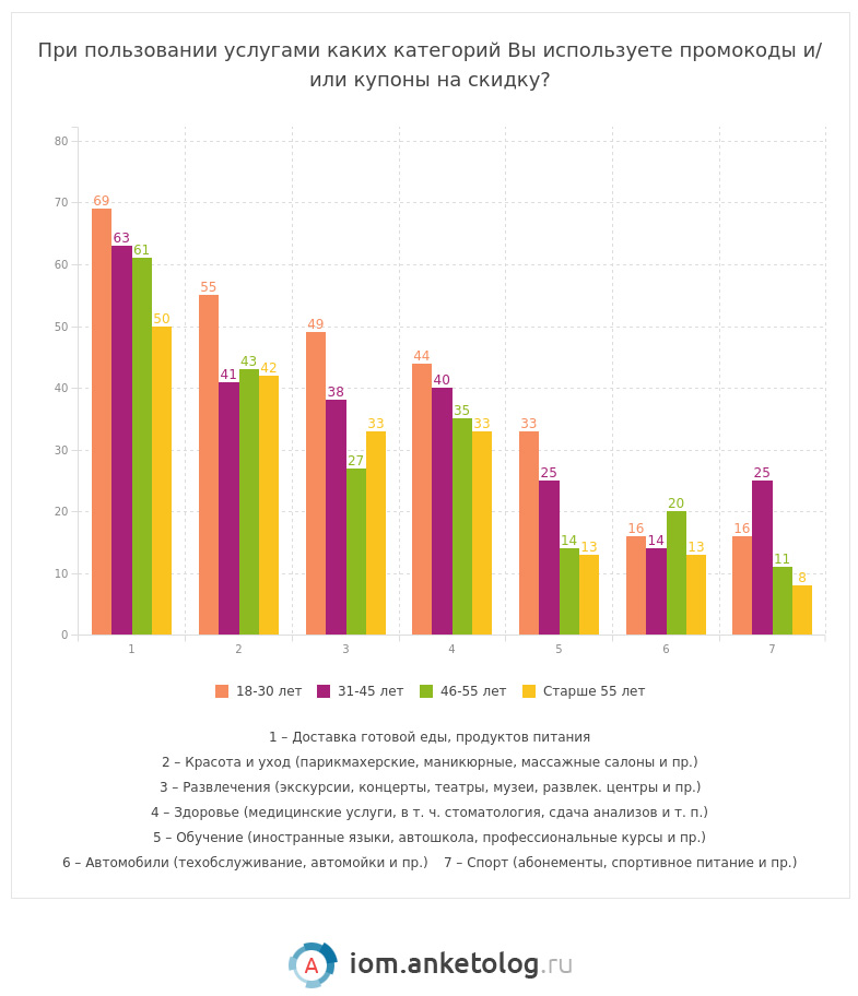 По данным последнего опроса «Анкетолога», 95 % потребителей пользуются купонами и промокодами на скидку, но при этом оценивают честность продавцов, предоставляющих скидку, всего в 6,1 балла из 10 возможных.