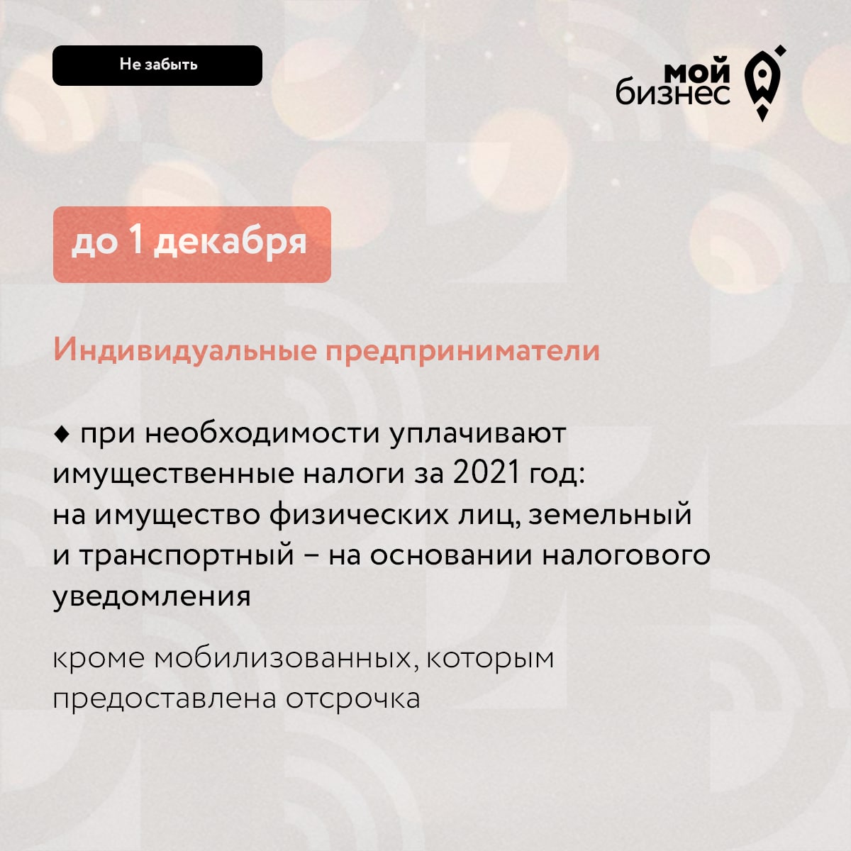 До 1 декабря индивидуальные предприниматели при необходимости уплачивают имущественные налоги за 2021 год: на имущество физических лиц, земельный и транспортный — на основании налогового уведомления. Кроме мобилизованных, которым предоставлена отсрочка.