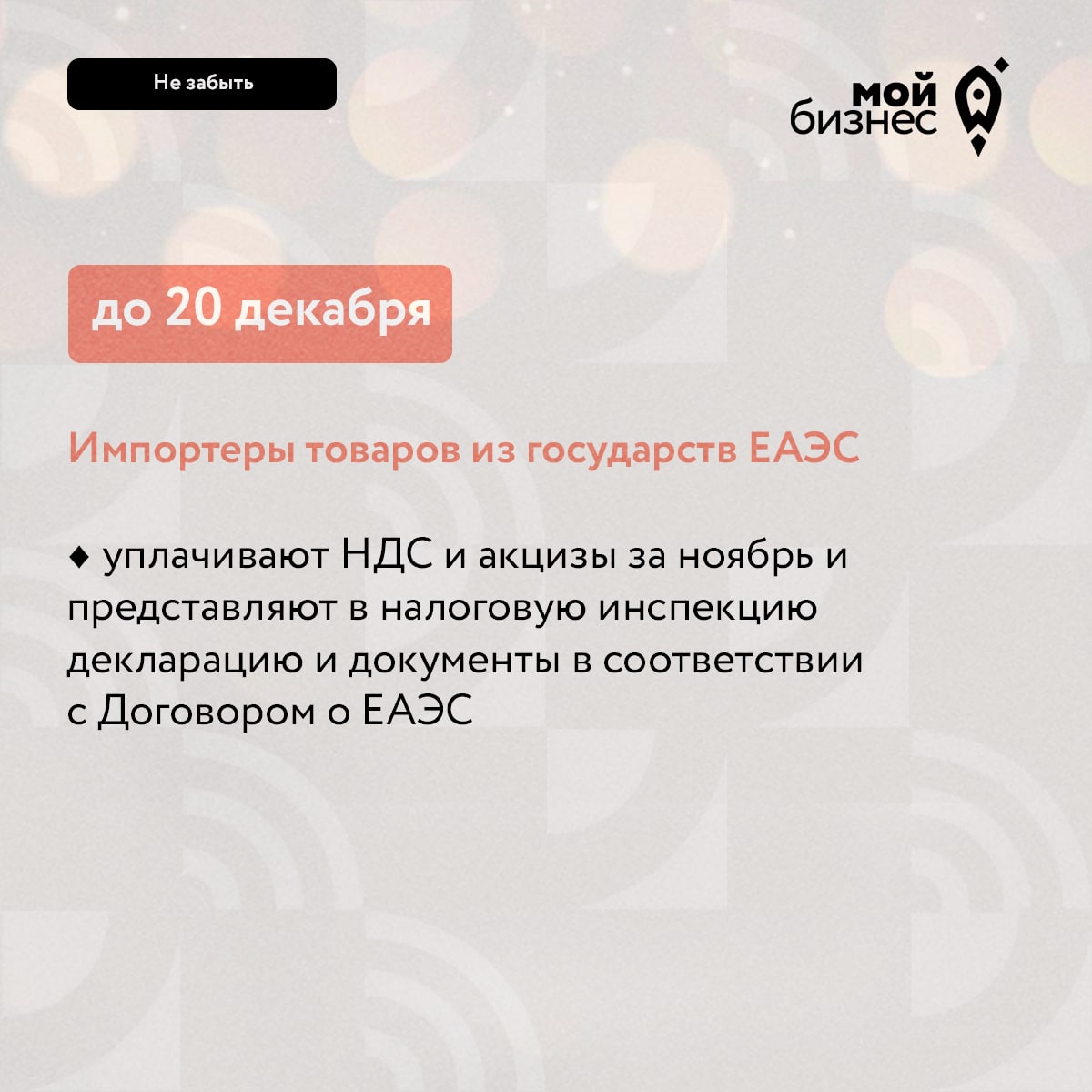 Импортёры товаров из государств ЕАЭС уплачивают НДС и акцизы за ноябрь и представляют в налоговую инспекцию декларацию и документы в соответствии с Договором о ЕАЭС.