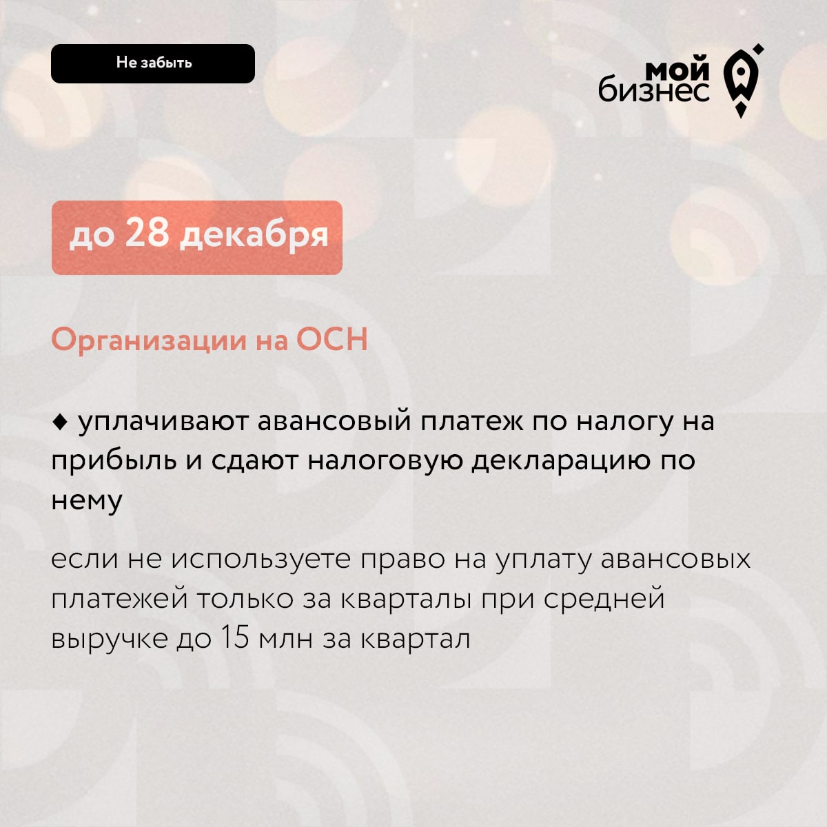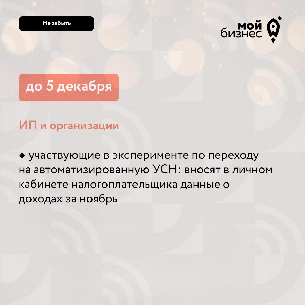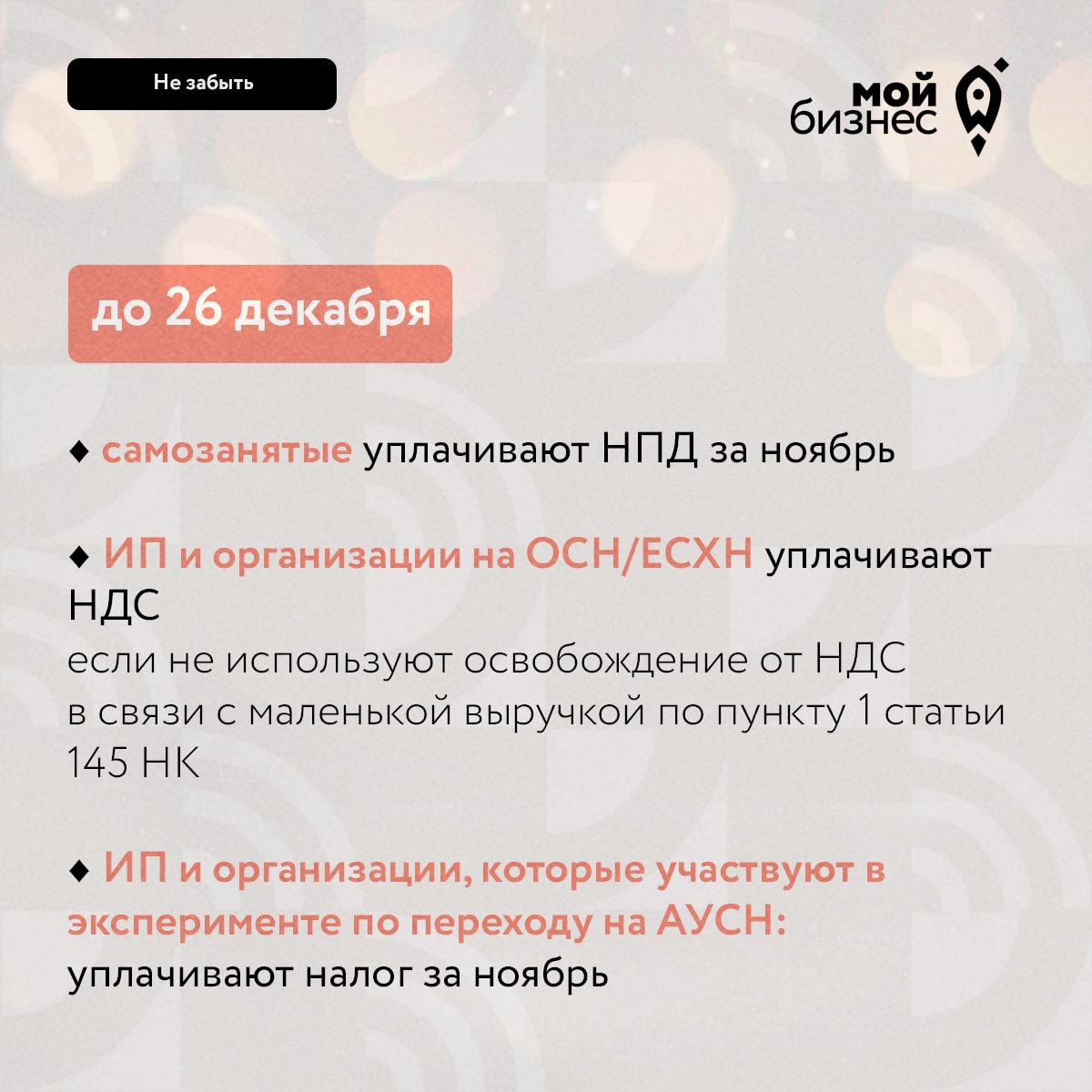 Самозанятые уплачивают налог на профессиональный доход за ноябрь. ИП и организации на ОСН/ЕСХН уплачивают НДС (если не используете освобождение от НДС в связи с маленькой выручкой по пункту 1 статьи 145 НК). ИП и организации, участвующие в эксперименте по переходу на автоматизированную УСН, уплачивают налог за ноябрь.