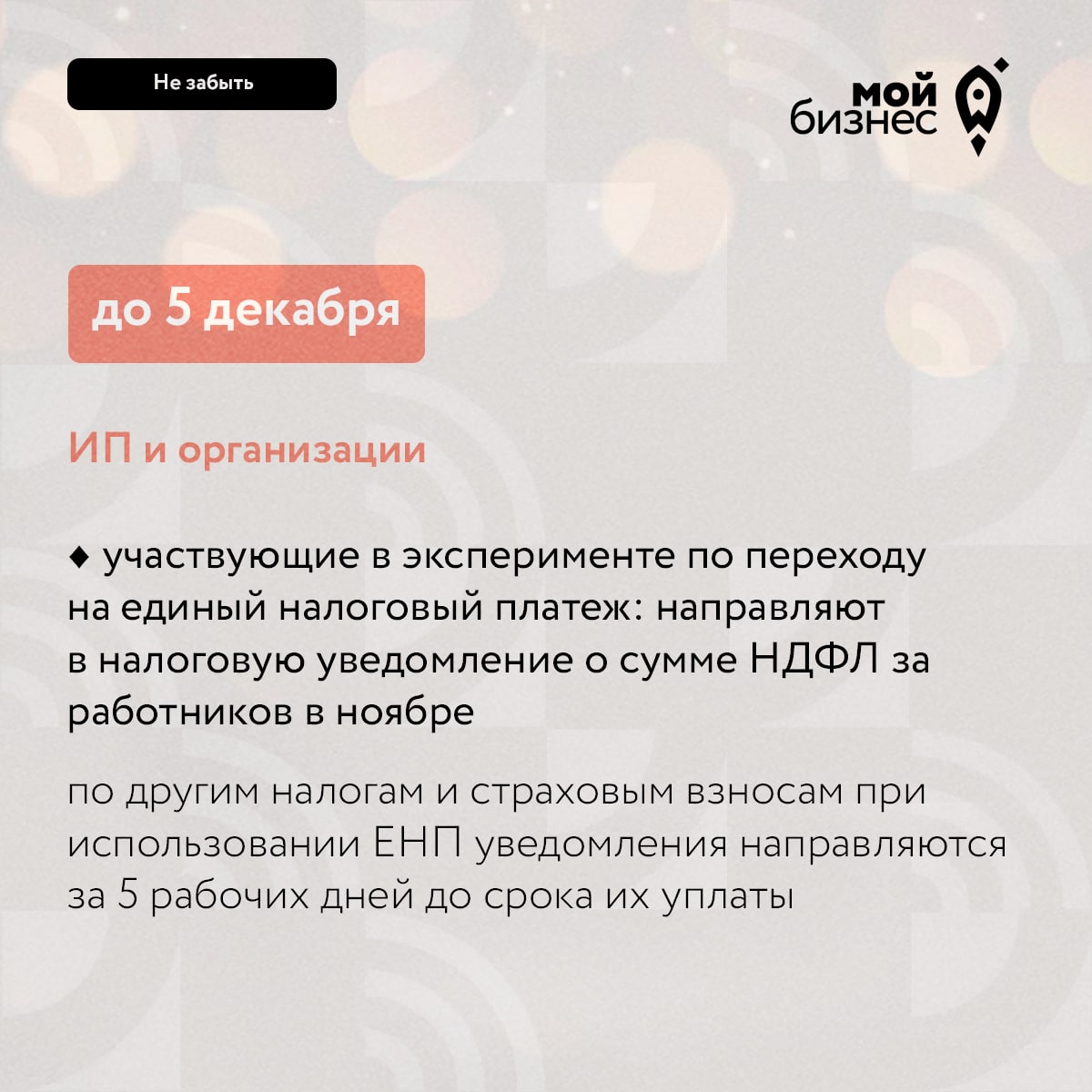 ИП и организации, участвующие в эксперименте по переходу на единый налоговый платёж, направляют в налоговую инспекцию уведомление о сумме НДФЛ, которую они перечислили за работников в ноябре. По другим налогам и страховым взносам при использовании ЕНП нужно направлять уведомления об исчисленных суммах за 5 рабочих дней до срока их уплаты.