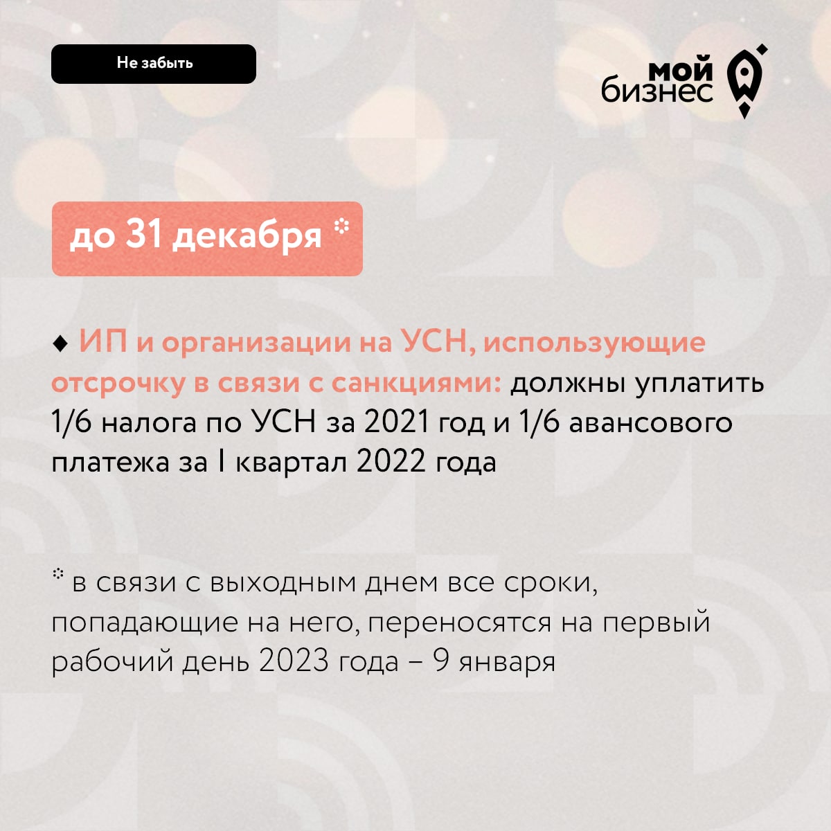 В связи с выходным днём все сроки, попадающие на него, переносятся на первый рабочий день 2023 года — 9 января.