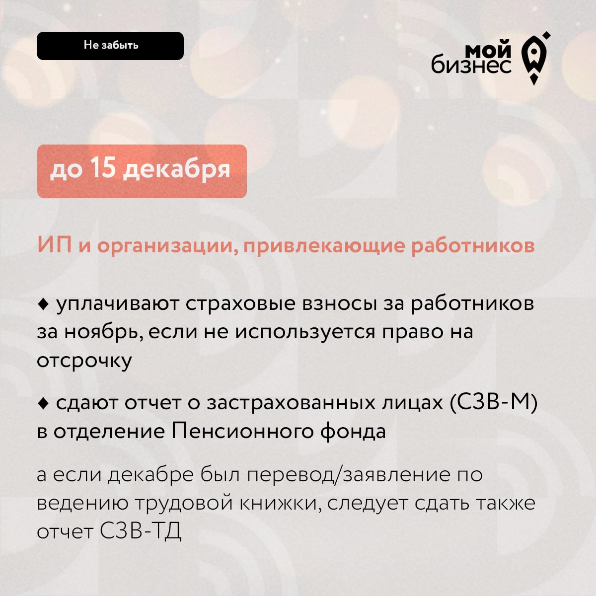 ИП и организации, привлекающие работников, уплачивают страховые взносы за работников за ноябрь (на пенсионное и медицинское страхование, страхование на случай временной нетрудоспособности и в связи с материнством — в налоговую инспекцию, взносы на травматизм — в отделение ФСС), если не используется право на отсрочку.