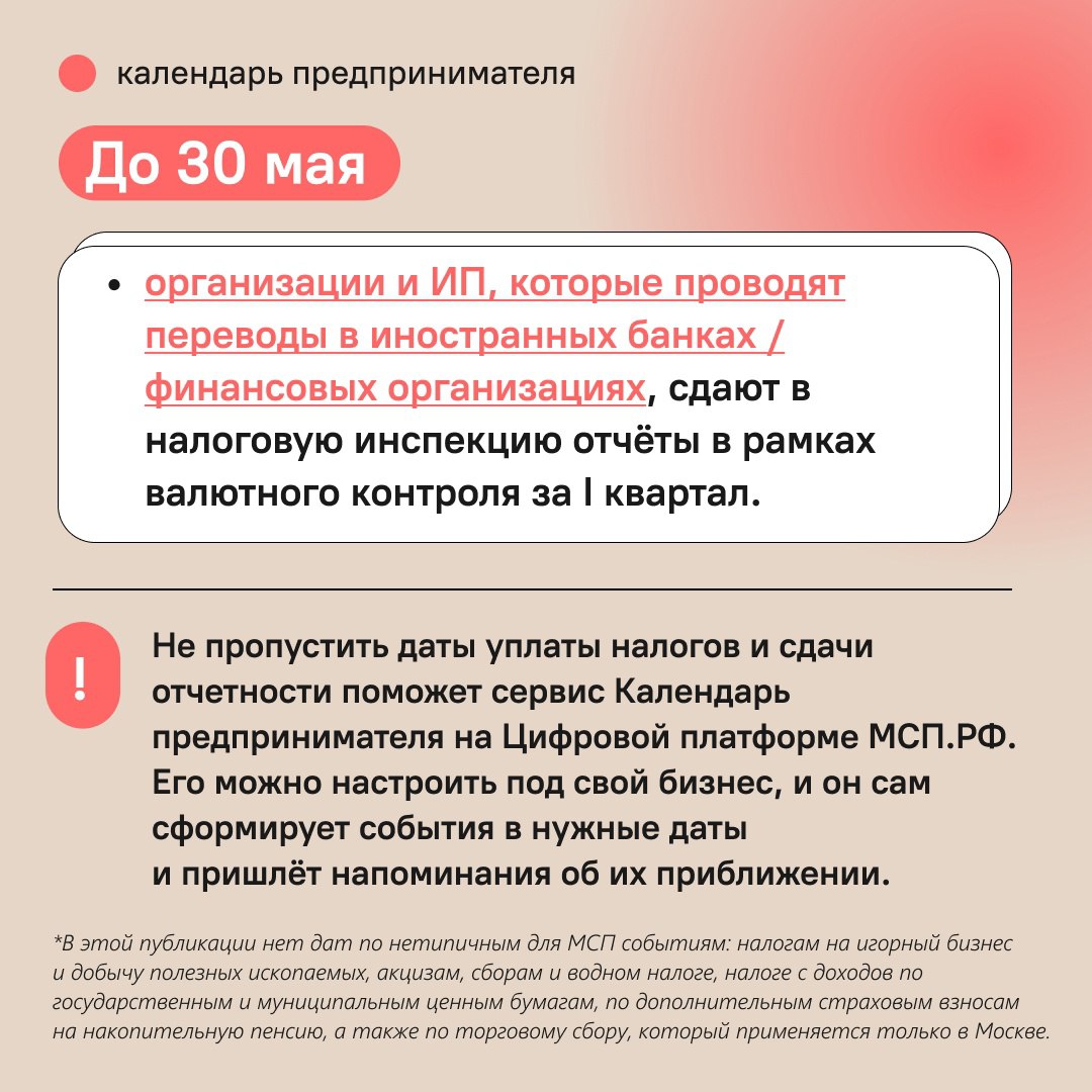 Телеграм-канал «Новости Корпорации МСП» опубликовал карточки с важными датами платежей и отчётности в мае.