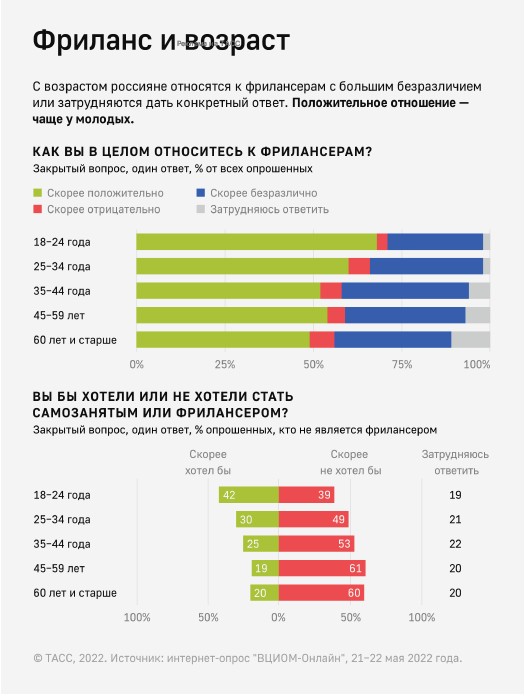 43 % сограждан считают, что люди их профессии могли бы работать на фрилансе; 74 % — занятые в СМИ; 72 % — сотрудники информационных технологий (ИТ); 61 % — работники сферы услуг и сервиса; 57 % — россияне из финансовой и страховой деятельности.