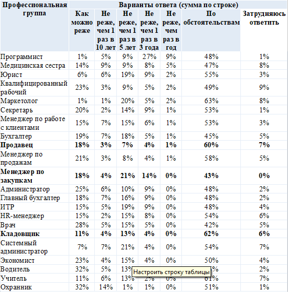 Что касается сферы торговли, мнения о том, что работу следует менять как можно реже, придерживаются 18 % продавцов, 18 % менеджеров по закупкам и 11 % кладовщиков.