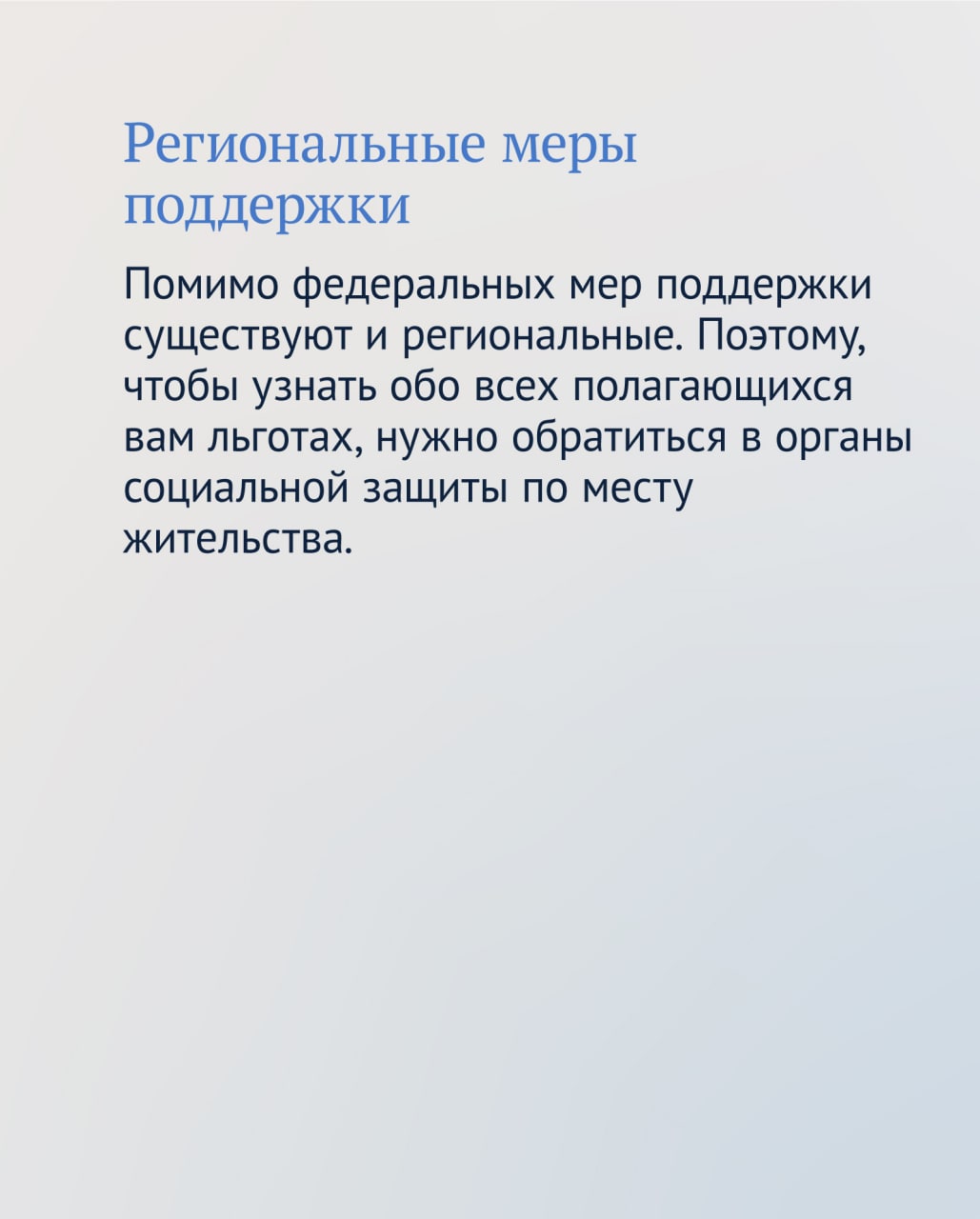 Помимо федеральных мер поддержки существуют и региональные. Поэтому, чтобы узнать обо всех полагающихся вам льготах, нужно обратиться в органы социальной защиты по месту жительства.
