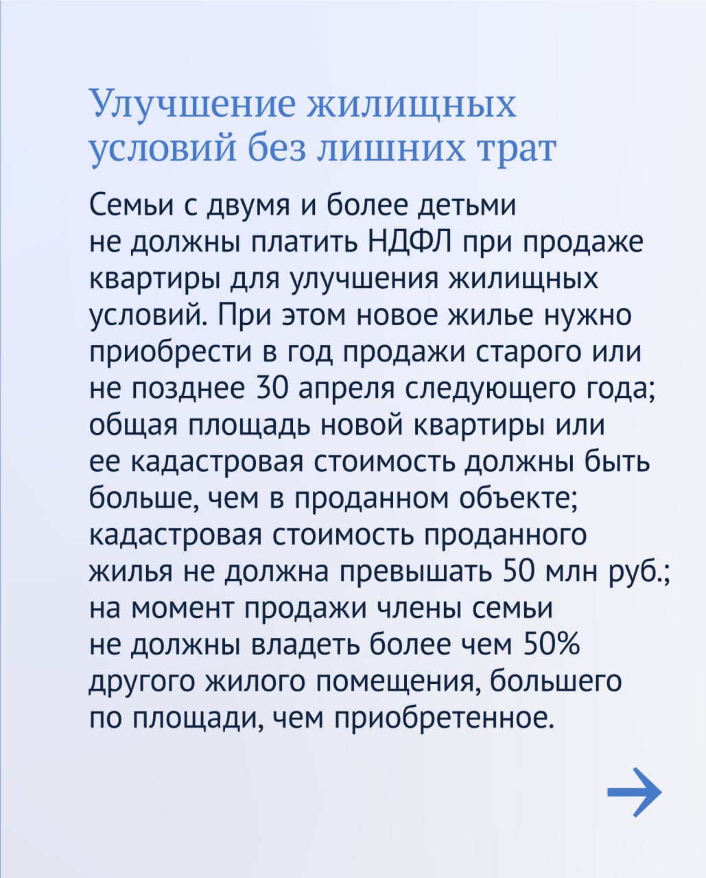 Семьи с двумя и более детьми не должны платить НДФЛ при продаже квартиры для улучшения жилищных условий.