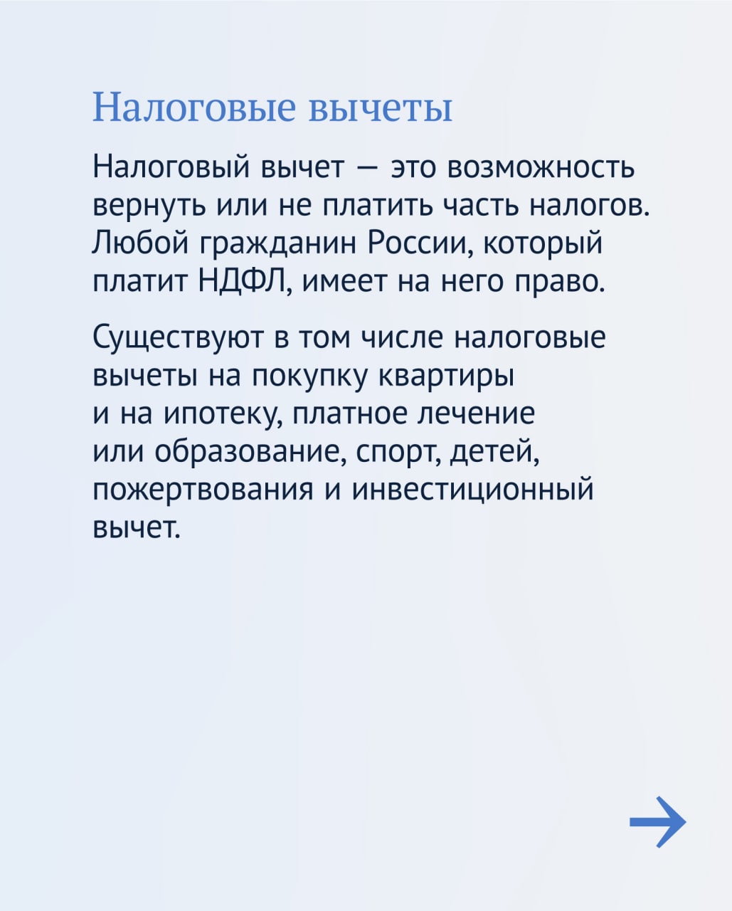 Существуют в том числе налоговые вычеты на покупку квартиры и на ипотеку, платное лечение или образование, спорт, детей, пожертвования и инвестиционный вычет.