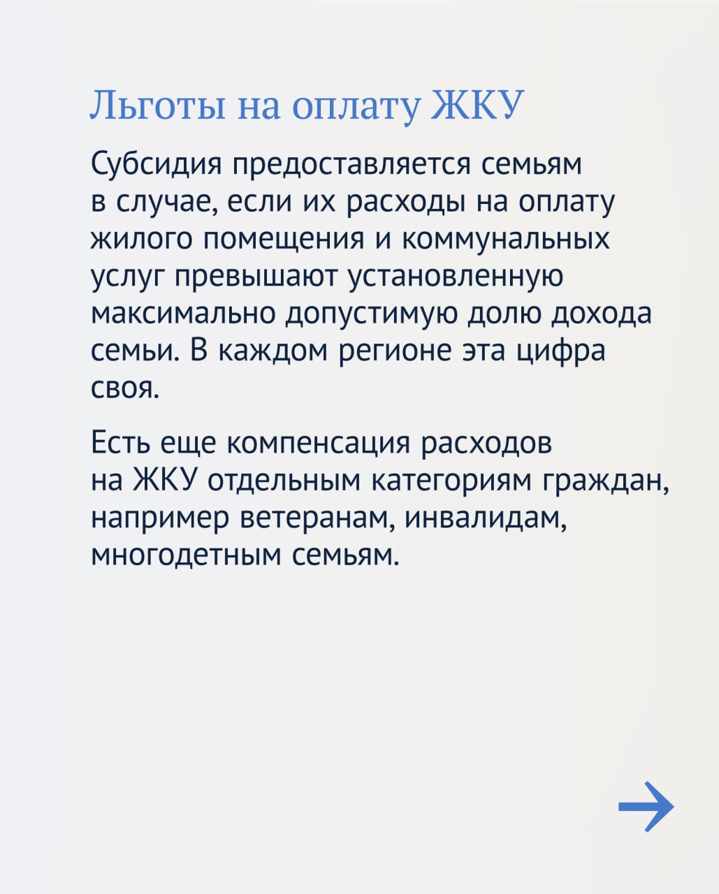 Есть ещё компенсация расходов на ЖКУ отдельным категориям граждан, например ветеранам, инвалидам, многодетным семьям.