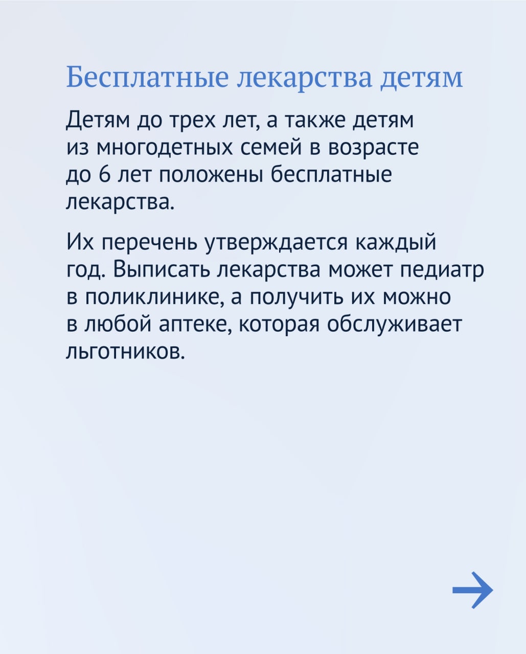 Детям до трёх лет, а также детям из многодетных семей в возрасте до 6 лет положены бесплатные лекарства.