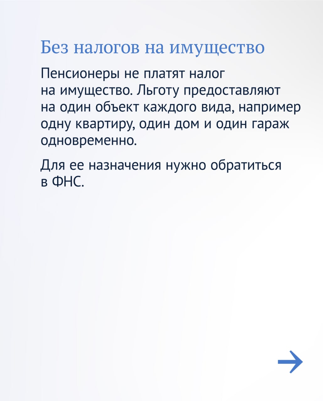Пенсионеры не платят налог на имущество. Льготу предоставляют на один объект каждого вида, например одну квартиру, один дом и один гараж одновременно. Для её назначения нужно обратиться в ФНС.