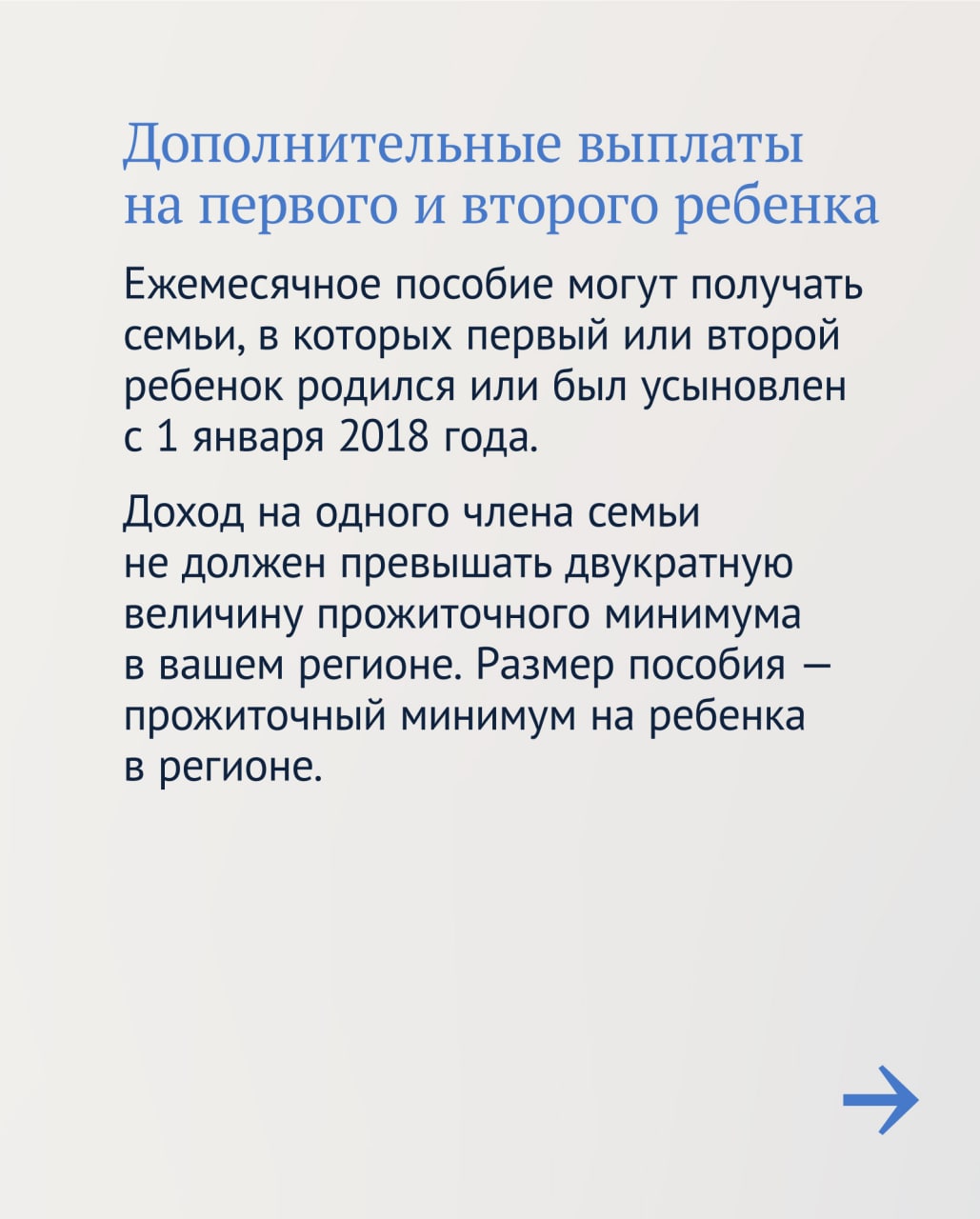 Ежемесячное пособие могут получать семьи, в которых первый или второй ребёнок родился или был усыновлён с 1 января 2018 года.