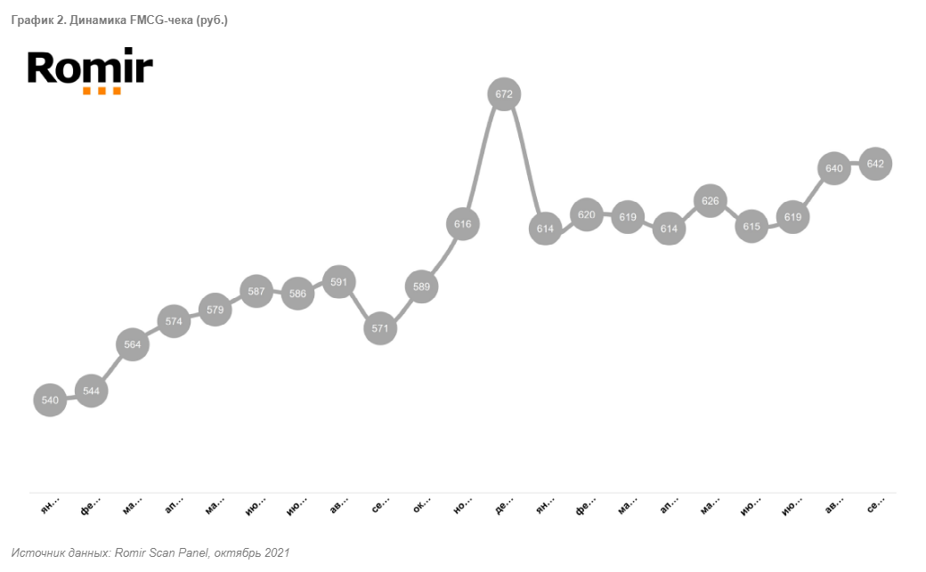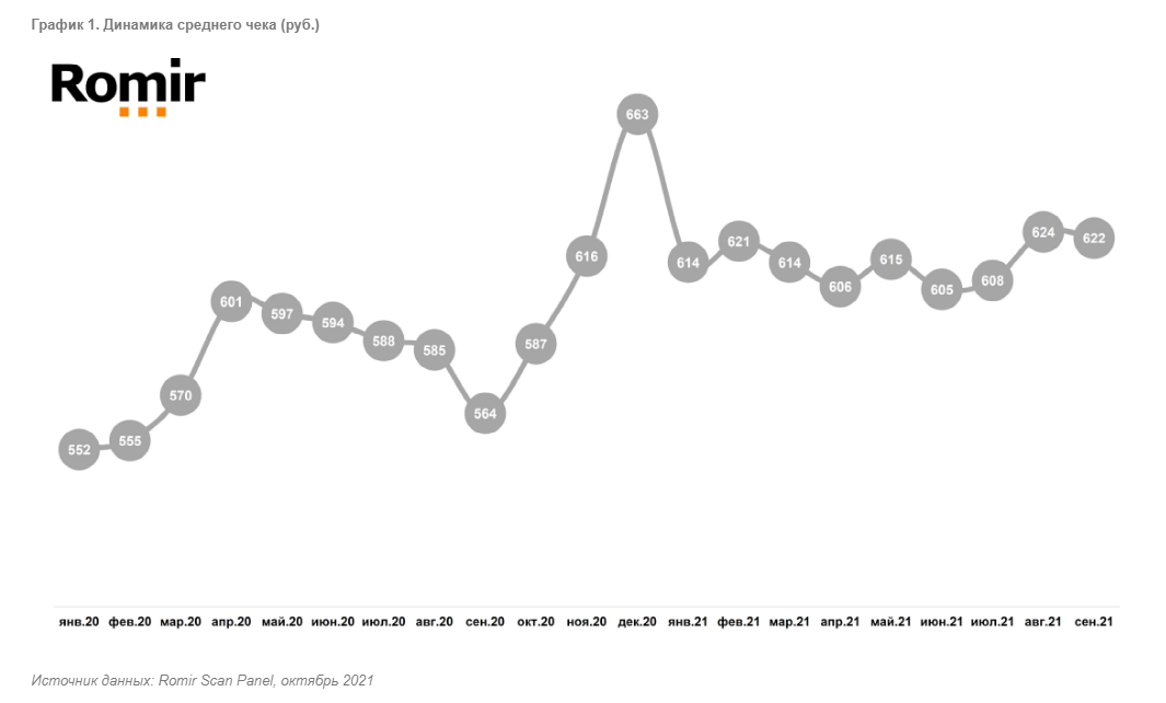 Согласно результатам исследования холдинга «Ромир», в сентябре месячный средний чек россиянина снизился всего на 2 рубля по сравнению с августом и составил 622 рубля. При этом довольно высокой остаётся динамика показателя год к году: рост — на 10,4 % относительно первого осеннего месяца 2020-го.