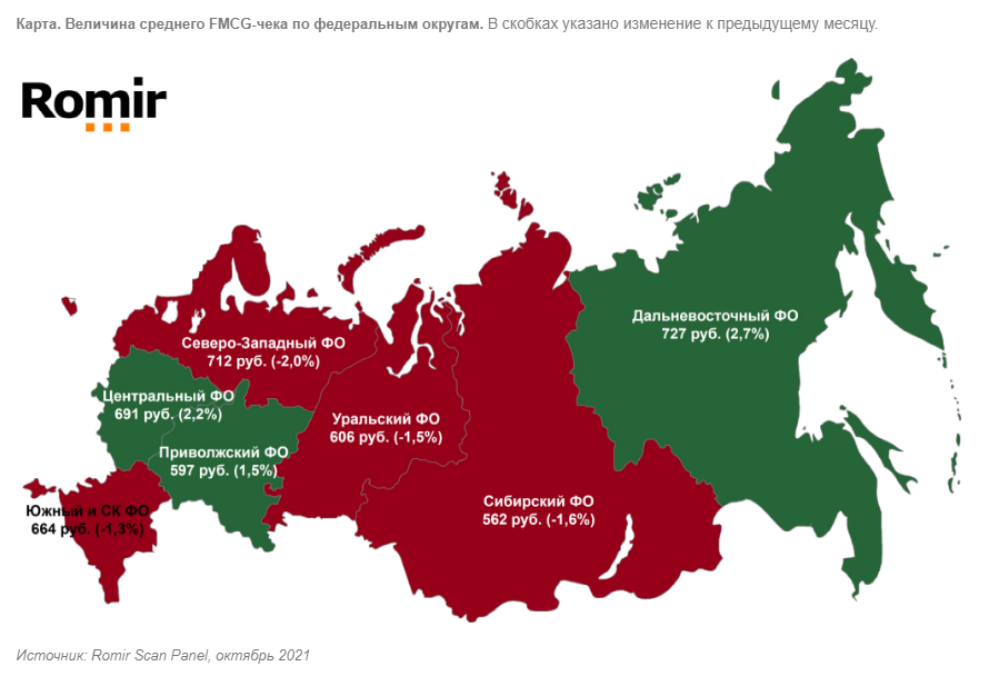 Примечательно, что относительно прошлого года месячный средний чек увеличился с одинаковой интенсивностью во всех федеральных округах страны, кроме Дальневосточного.