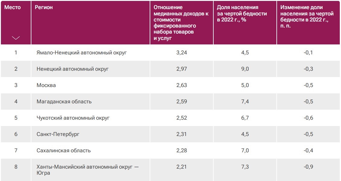 Самыми благополучными в материальном отношении регионами России по итогам 2022 года стали Ямало-Ненецкий и Ненецкий автономные округа. Третью строчку рейтинга занимает Москва. На последних позициях находятся Карачаево-Черкессия, Тува и Ингушетия.