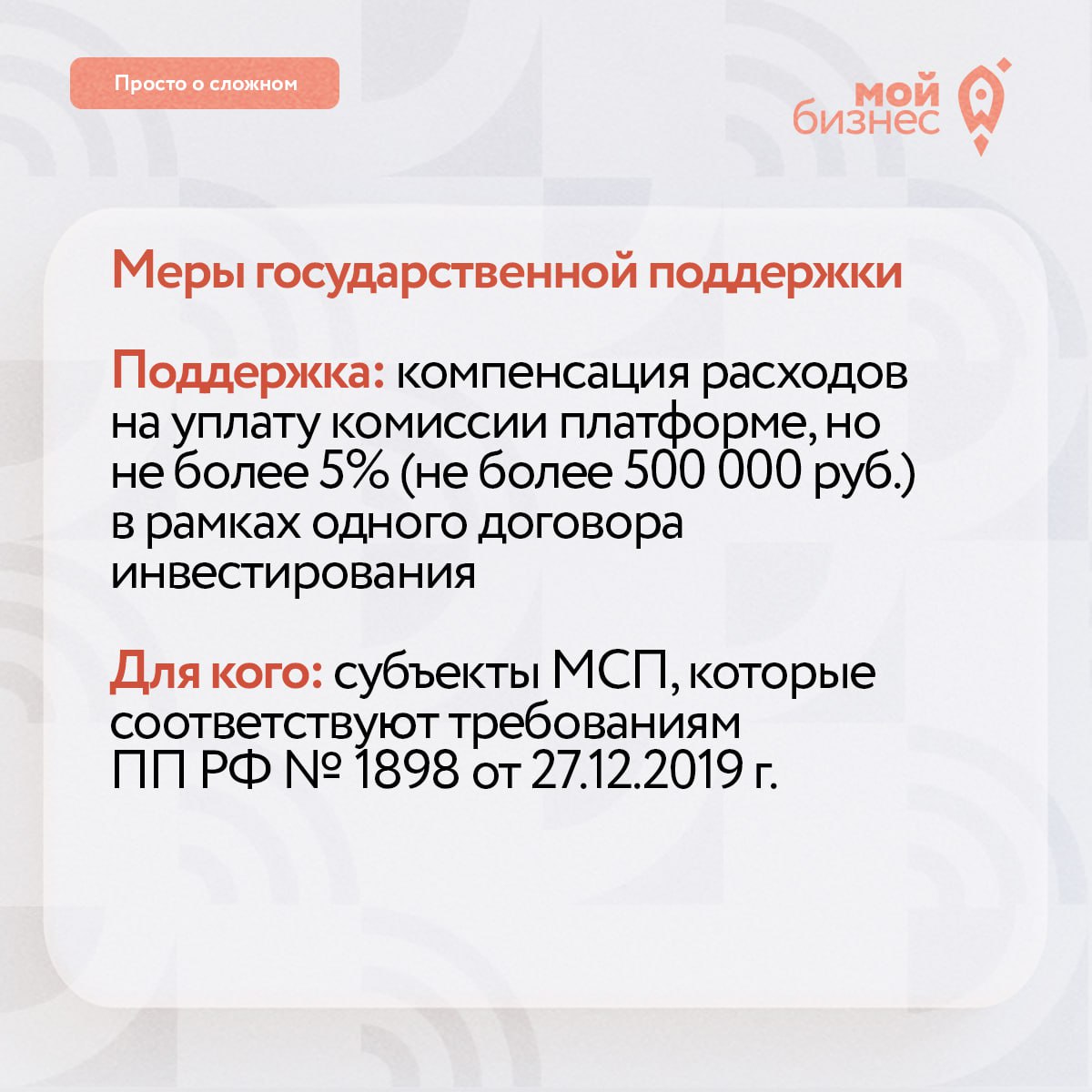 Чтобы получить компенсацию части затрат по привлечению инвестиций через платформу, предприятие должно входить в реестр субъектов МСП и быть налогоплательщиком РФ.