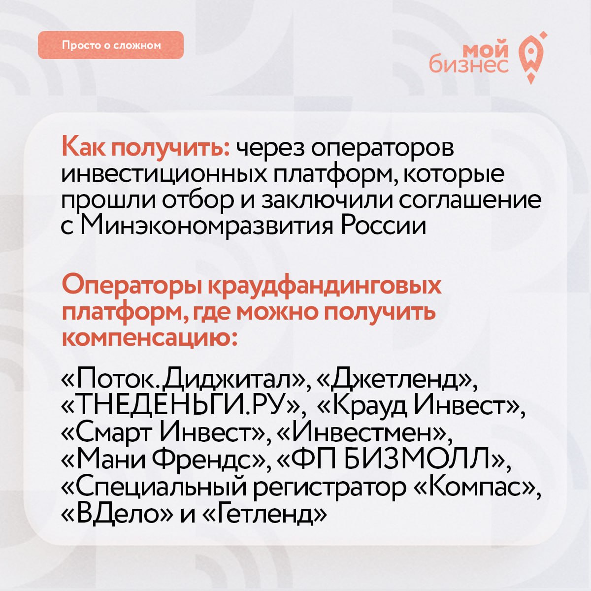 Компенсация также распространяется на кредитные и страховые организации, инвестиционные фонды, профессиональных участников рынка ценных бумаг, ломбарды, игорный бизнес. Узнать порядок получения компенсации можно в компании-операторе площадки.