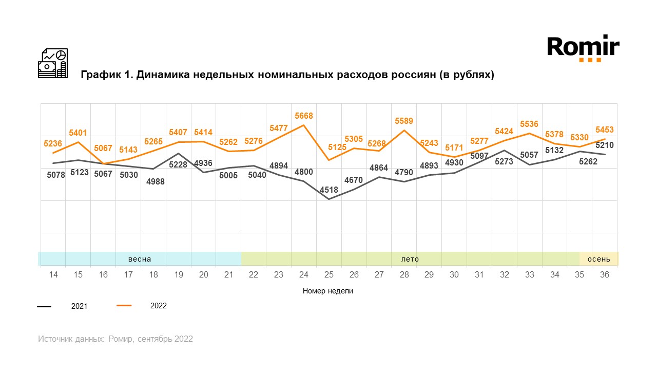 C 5 по 11 сентября средние недельные расходы россиян увеличились по сравнению с предшествующей неделей на 2,3 %. ИНР составил 5453 ₽. В годовой динамике этот индекс вырос на 4,7 %.