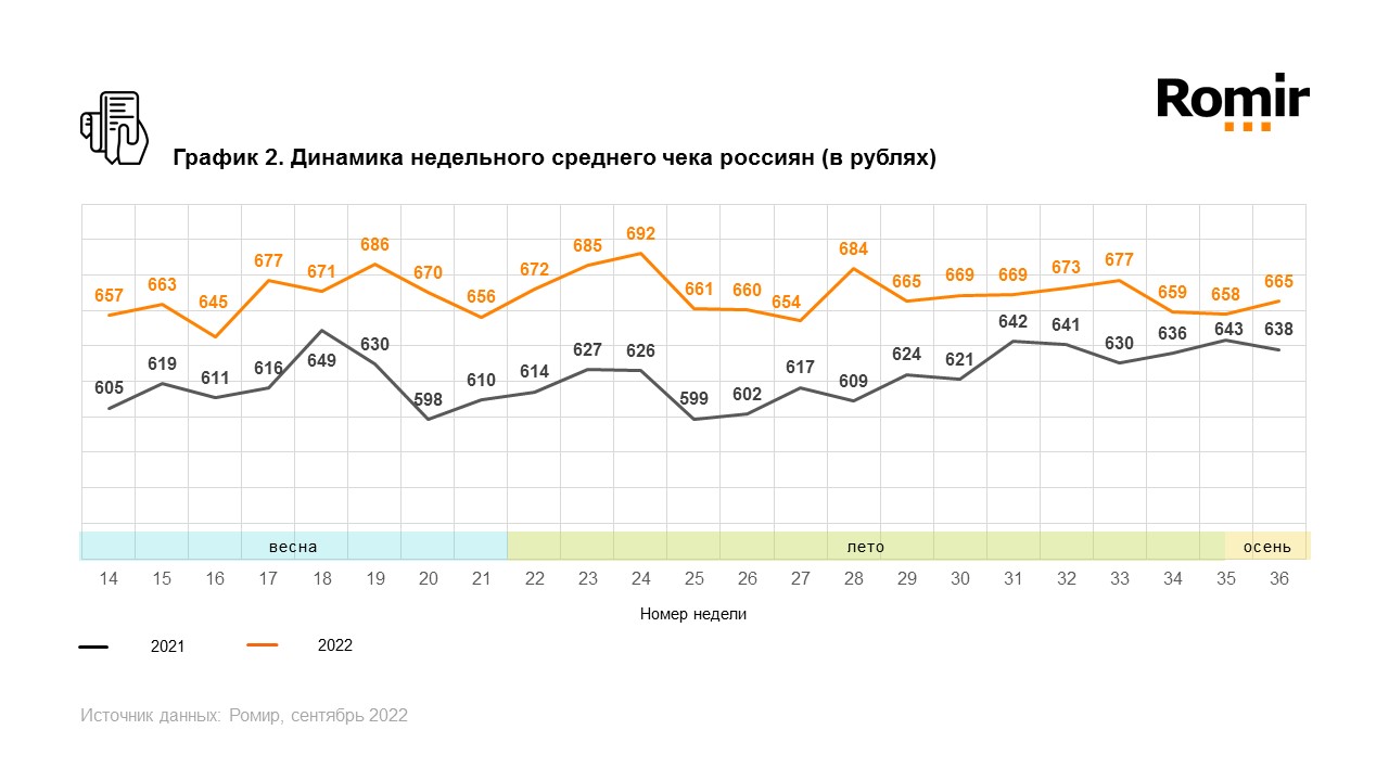 Исследовательский холдинг «Ромир» представил данные по индексу недельных расходов (ИНР) и индексу недельного среднего чека (ИНСЧ).