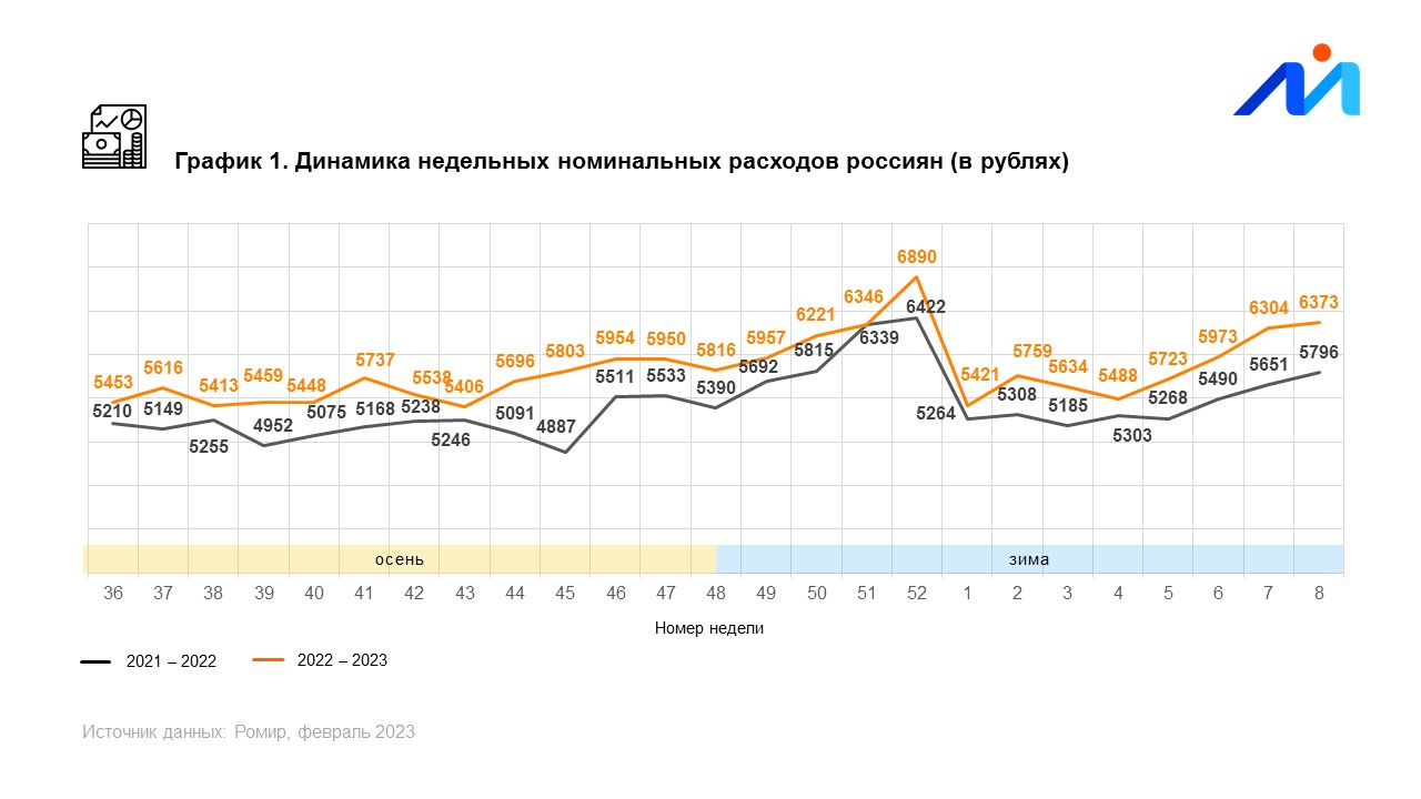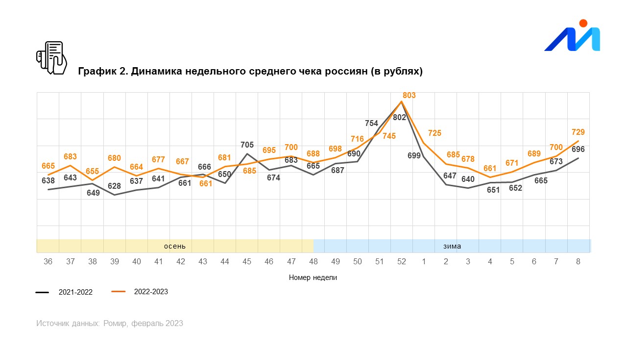 Исследовательский холдинг «Ромир» представил данные по индексу недельных расходов (ИНР) и индексу недельного среднего чека (ИНСЧ).