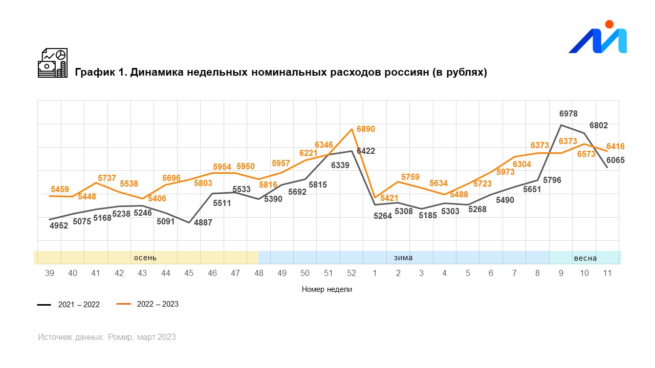 С 13 по 19 марта средние недельные расходы россиян по сравнению с предшествующей неделей снизились на 2,4 %. ИНР в денежном выражении составил 6416 ₽. В годовой динамике индекс вырос на 5,8 %.