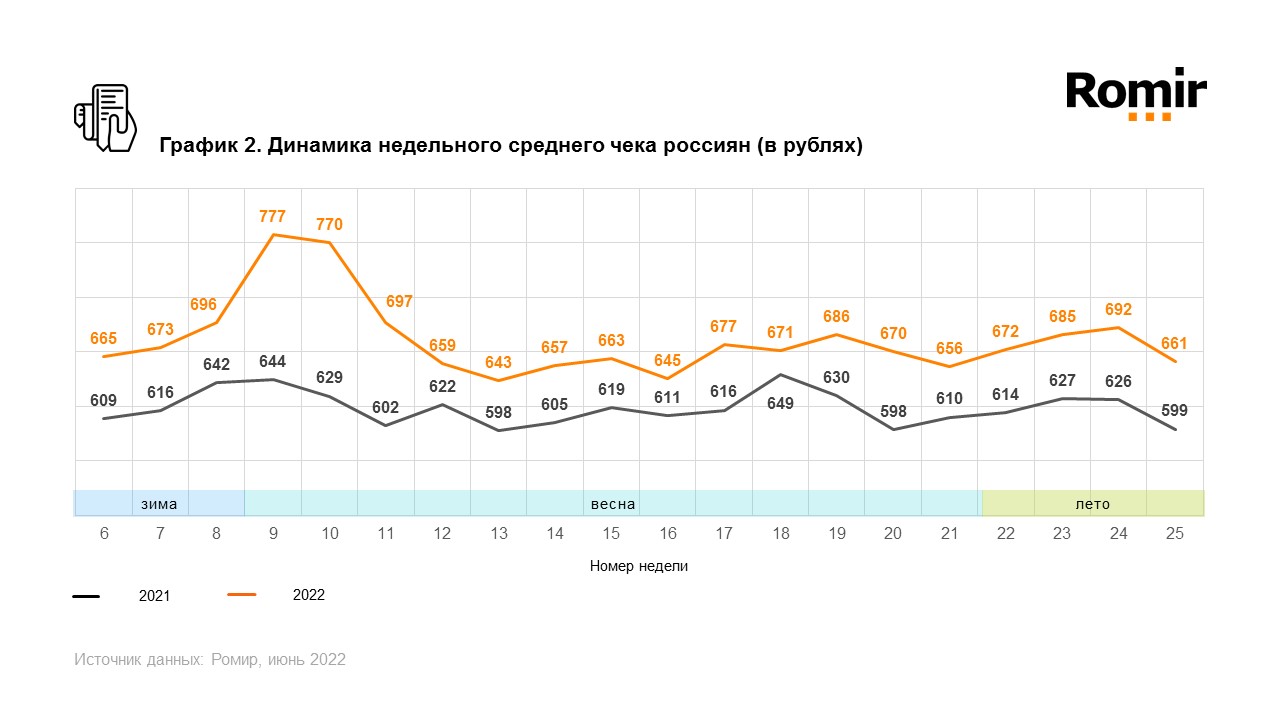 При этом в годовой динамике расходы выросли на 13,4 %. Индекс среднего чека (ИСЧ) по сравнению с предшествующей неделей сократился на 4,5 %. Средняя стоимость одной покупки составила 661 ₽. По сравнению с аналогичным периодом прошлого года индекс показывает рост на 10,4 %.
