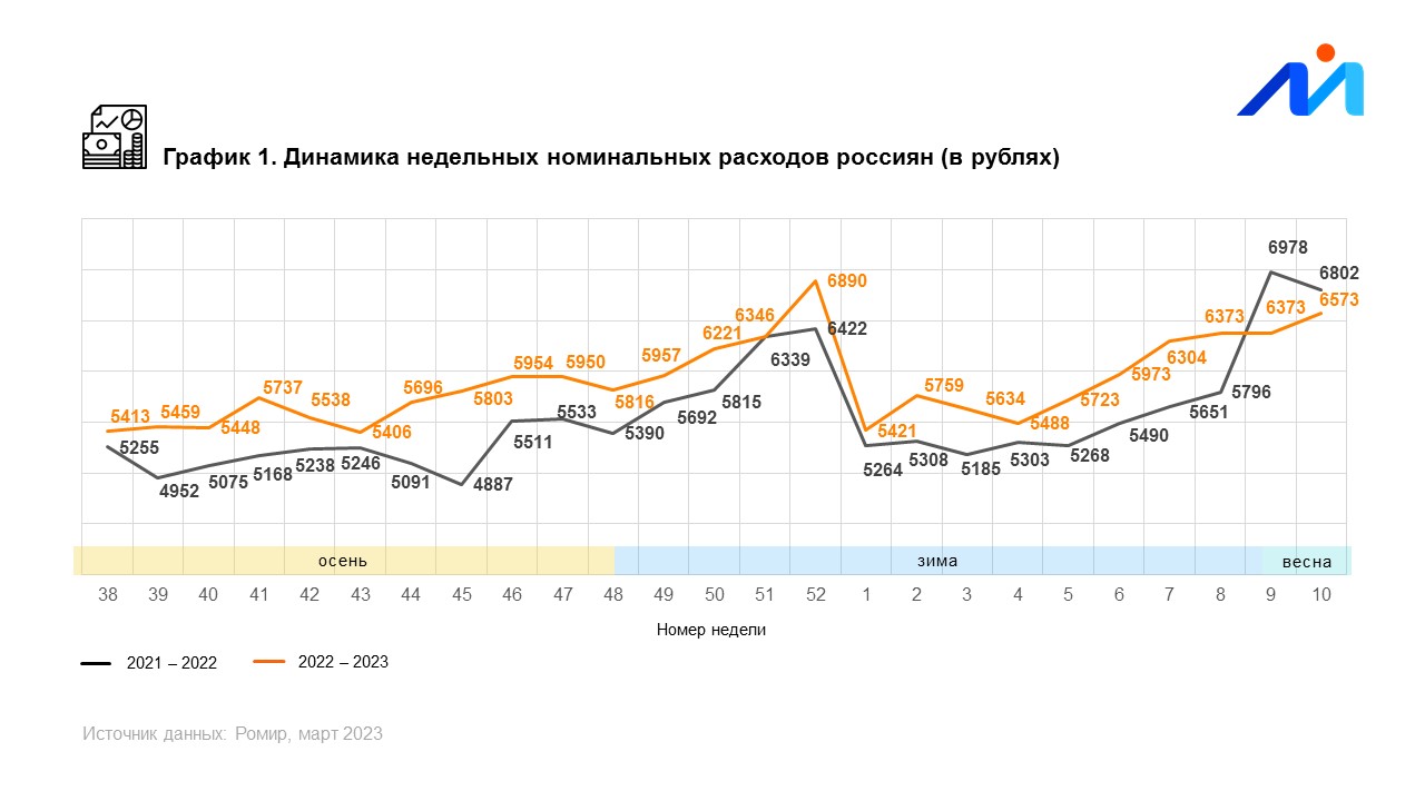 С 6 по 12 марта средние недельные расходы россиян по сравнению с предшествующей неделей выросли на 3,1 %. ИНР в денежном выражении составил 6573 ₽. В годовой динамике индекс сократился на 3,4 %.
