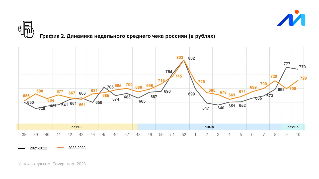 Исследовательский холдинг «Ромир» представил данные по индексу недельных расходов (ИНР) и индексу недельного среднего чека (ИНСЧ).