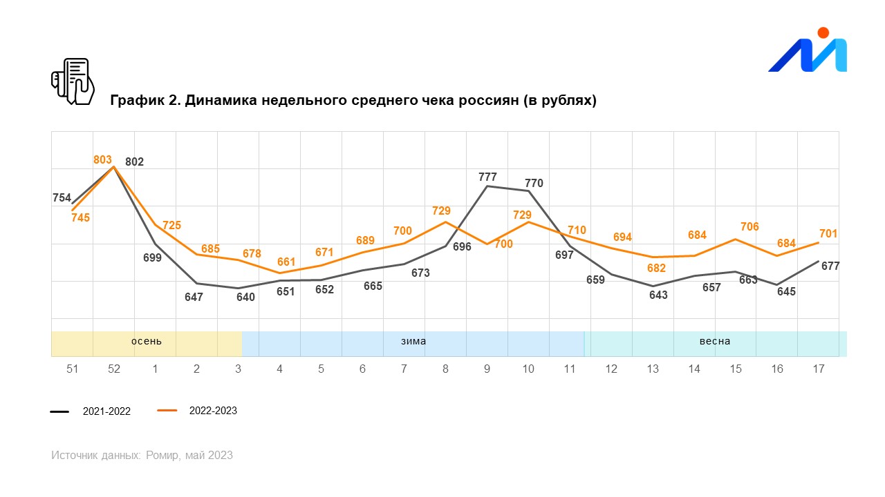 За 17-ю неделю года, с 24 по 30 апреля, средние расходы россиян выросли на 2 % в сравнении с 16-й неделей и составили в денежном выражении 6327 ₽. В годовой динамике ИНР вырос на 23 %.