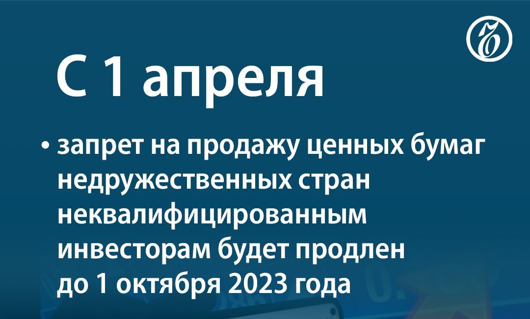 - С 1 апреля запрет на продажу ценных бумаг недружественных стран неквалифицированным инвесторам продлят до 1 октября 2023 года.