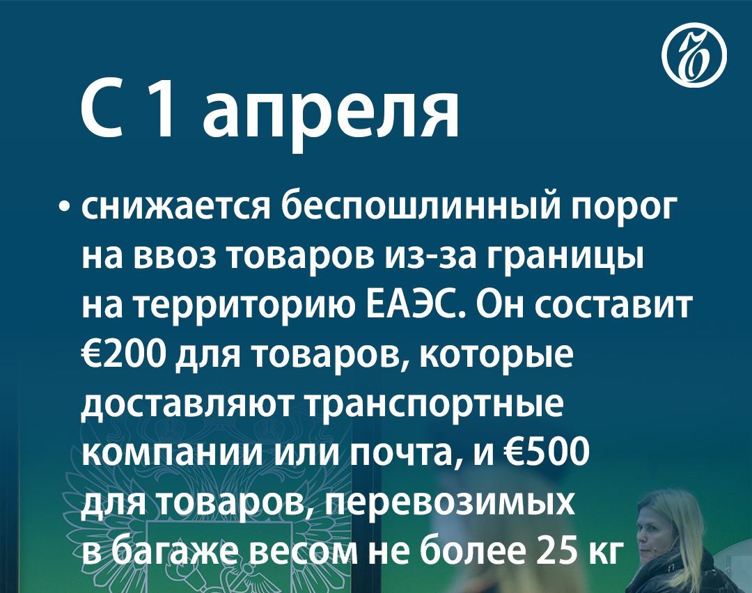 - С 1 апреля снижается беспошлинный порог на ввоз товаров из-за границы на территорию ЕАЭС. Он составит 200 евро для товаров, которые доставляют транспортные компании или почта, и 500 € для товаров, перевозимых в багаже весом не более 25 кг.