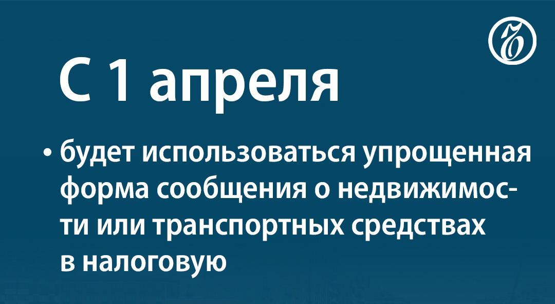 - С 1 апреля будет использоваться упрощённая форма сообщения о недвижимости или транспортных средствах в налоговую. В документе больше не нужно будет указывать виды недвижимости, реквизиты прилагаемых документов о правах на земельные участки и отдельные характеристики автомобилей.