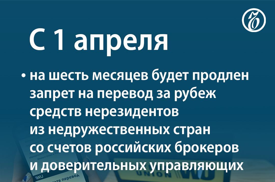 - С 1 апреля на шесть месяцев продлят запрет на перевод за рубеж средств нерезидентов из недружественных стран со счетов российских брокеров и доверительных управляющих.